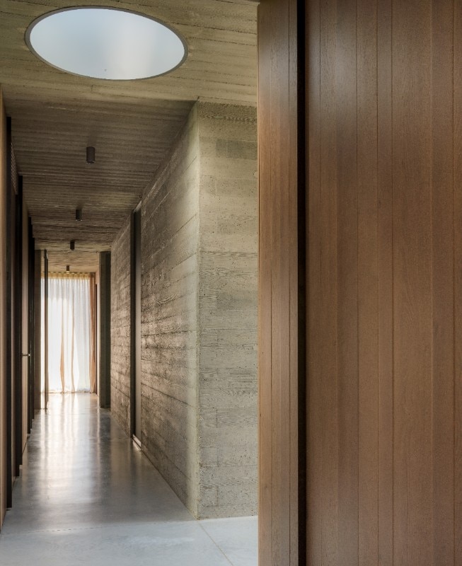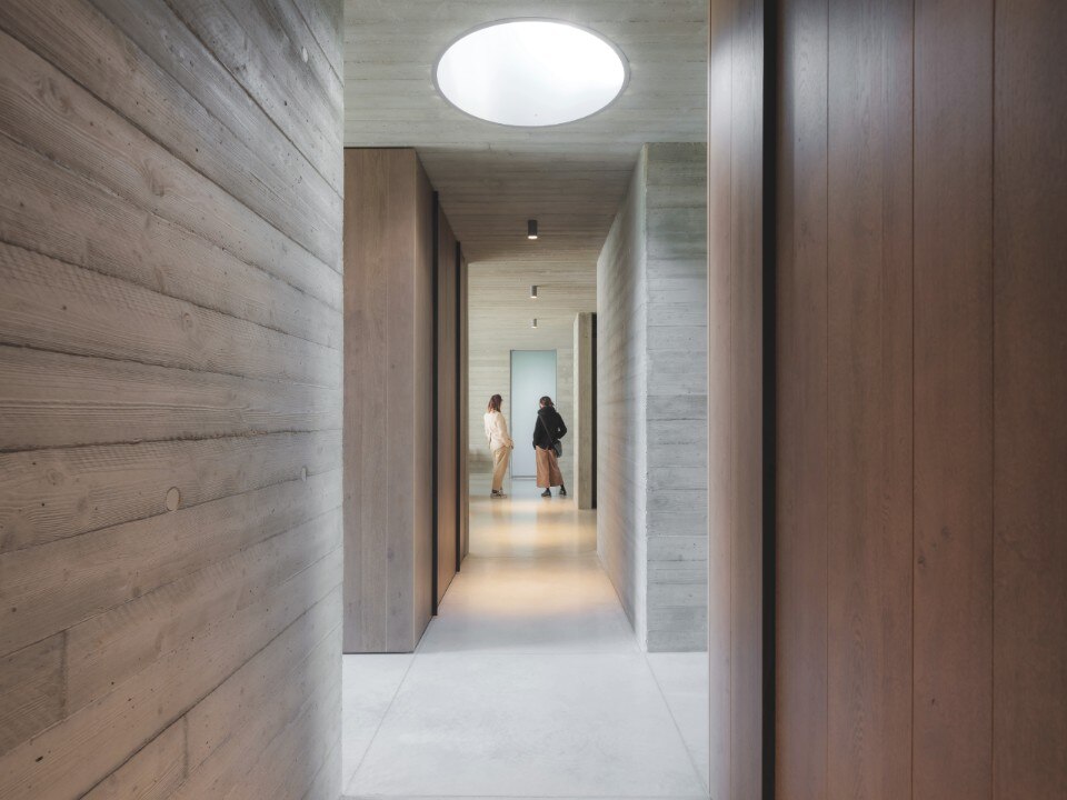 Un lucernario circolare illumina gli assi verticali e orizzontali del corridoio, che divide diametralmente l’area giorno dalla zona notte e serve a distribuire gli ambienti.