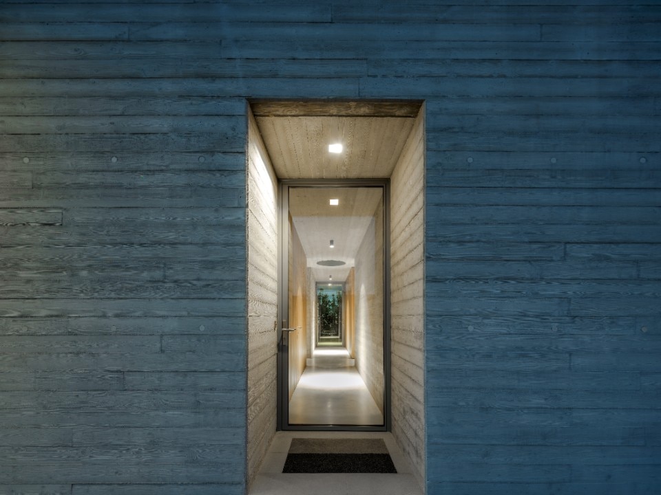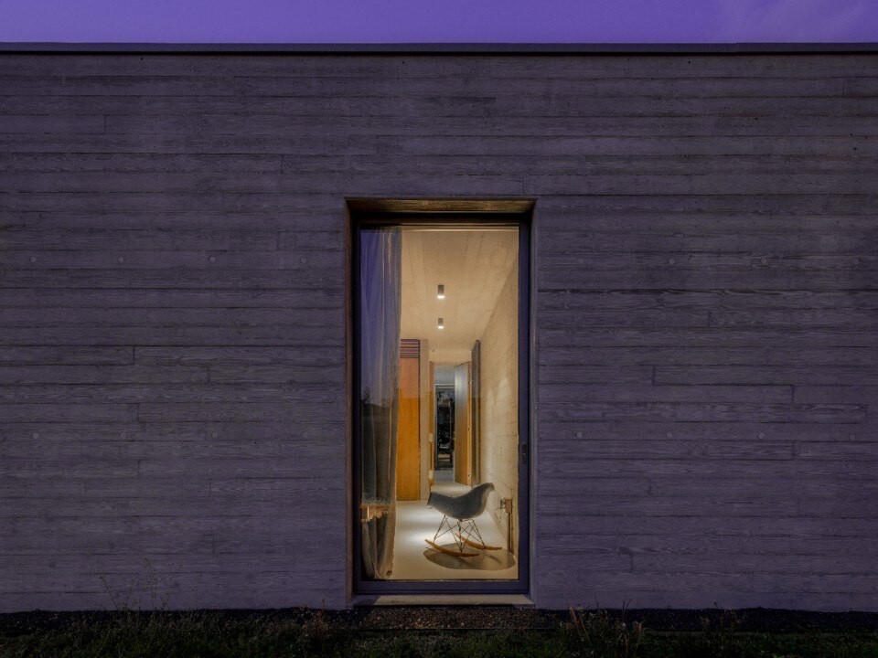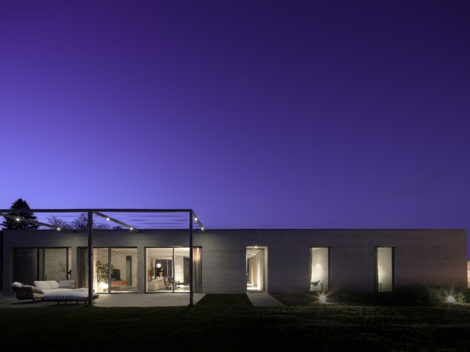 L’abitazione si sviluppa su un unico piano di 287 mq, integrandosi all’interno del contesto rurale. L’alternanza di pieni e vuoti, data dalle ampie vetrate, scandisce la suddivisione degli interni e le loro funzioni. Gli ambienti della zona notte risultano intimi, l’area giorno è caratterizzata da grandi aperture.