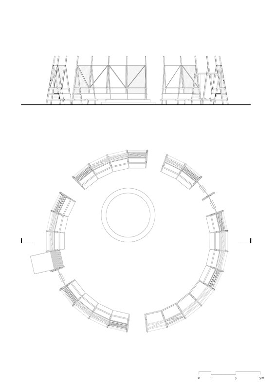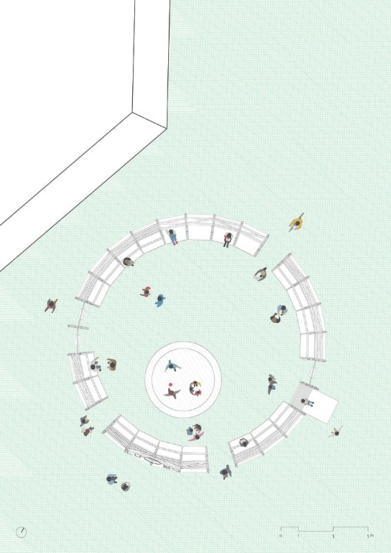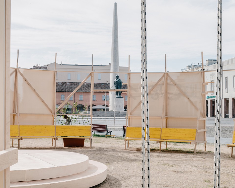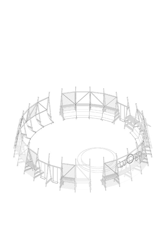 L’installazione è un cerchio, che nelle architetture nomadi è la forma attraverso cui si identifica un ambiente, ed è pensata per i cittadini. Si tratta di un’architettura effimera, uno spazio multiforme, un recinto permeabile che trasforma lo spazio pubblico proponendo nuove funzioni.