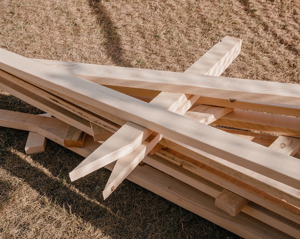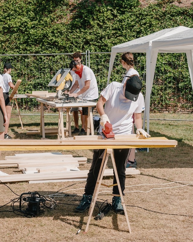 Il montaggio si è svolto con la collaborazione di abitanti, studenti e professionisti: moduli semplici hanno dato forma a un’architettura unitaria ma eterogenea e trasformabile.