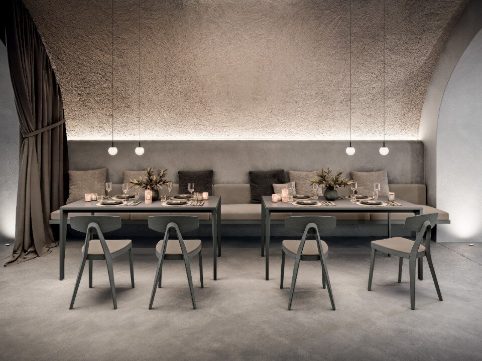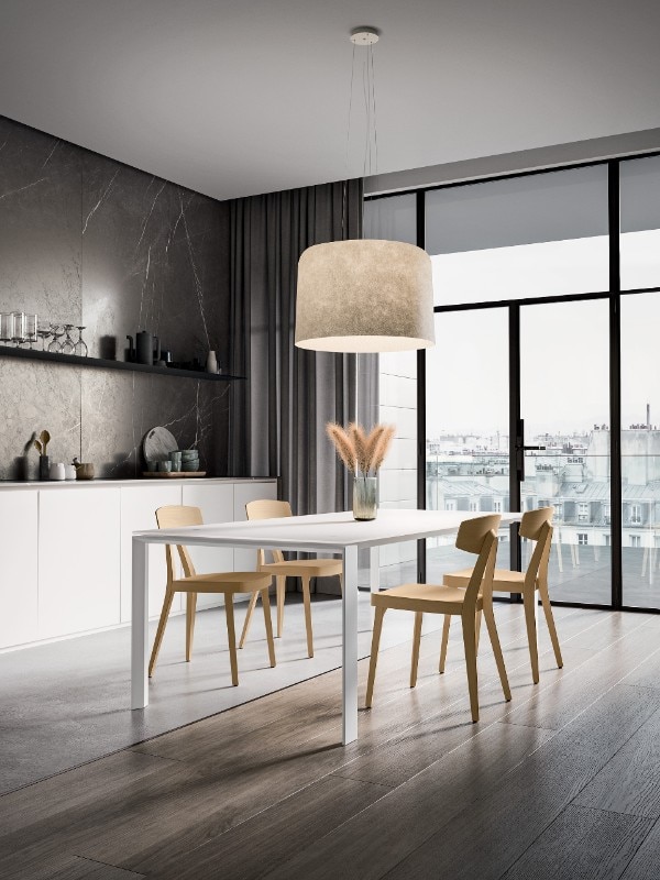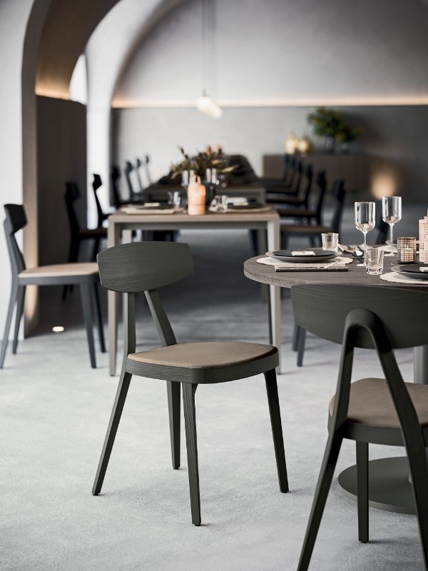 Lo schienale ospita un pannello curvato a spessore differenziato e il sedile può essere in legno di frassino nelle tinte Rovere, Noce, Grigio ombra e Bianco, oppure può essere imbottito e rivestito in tessuto o pelle.