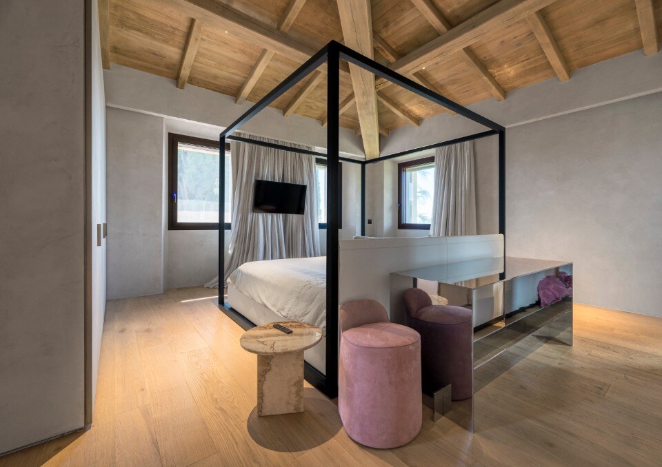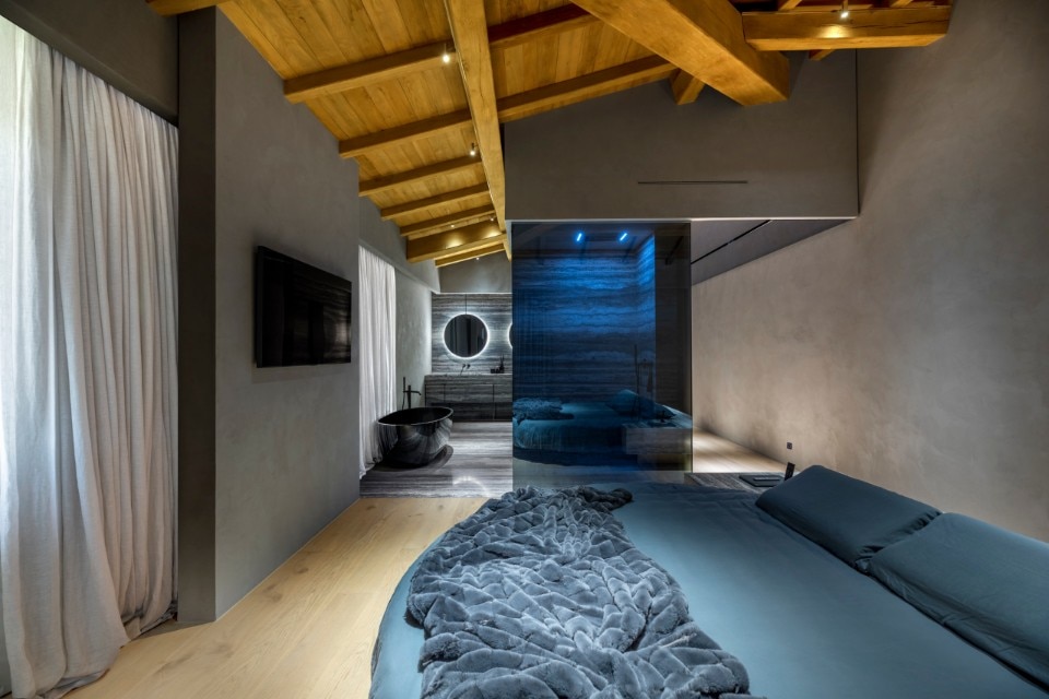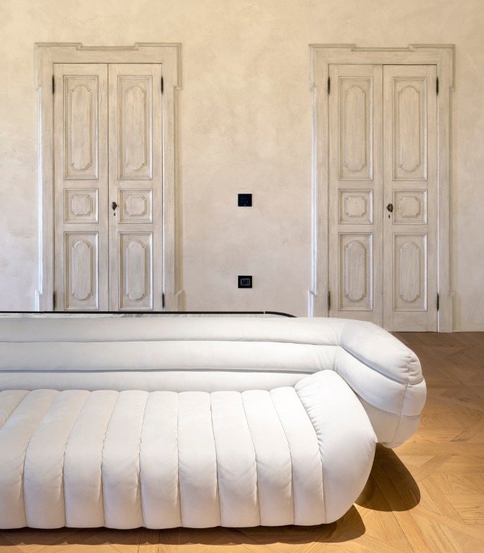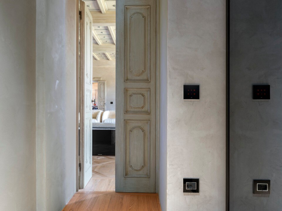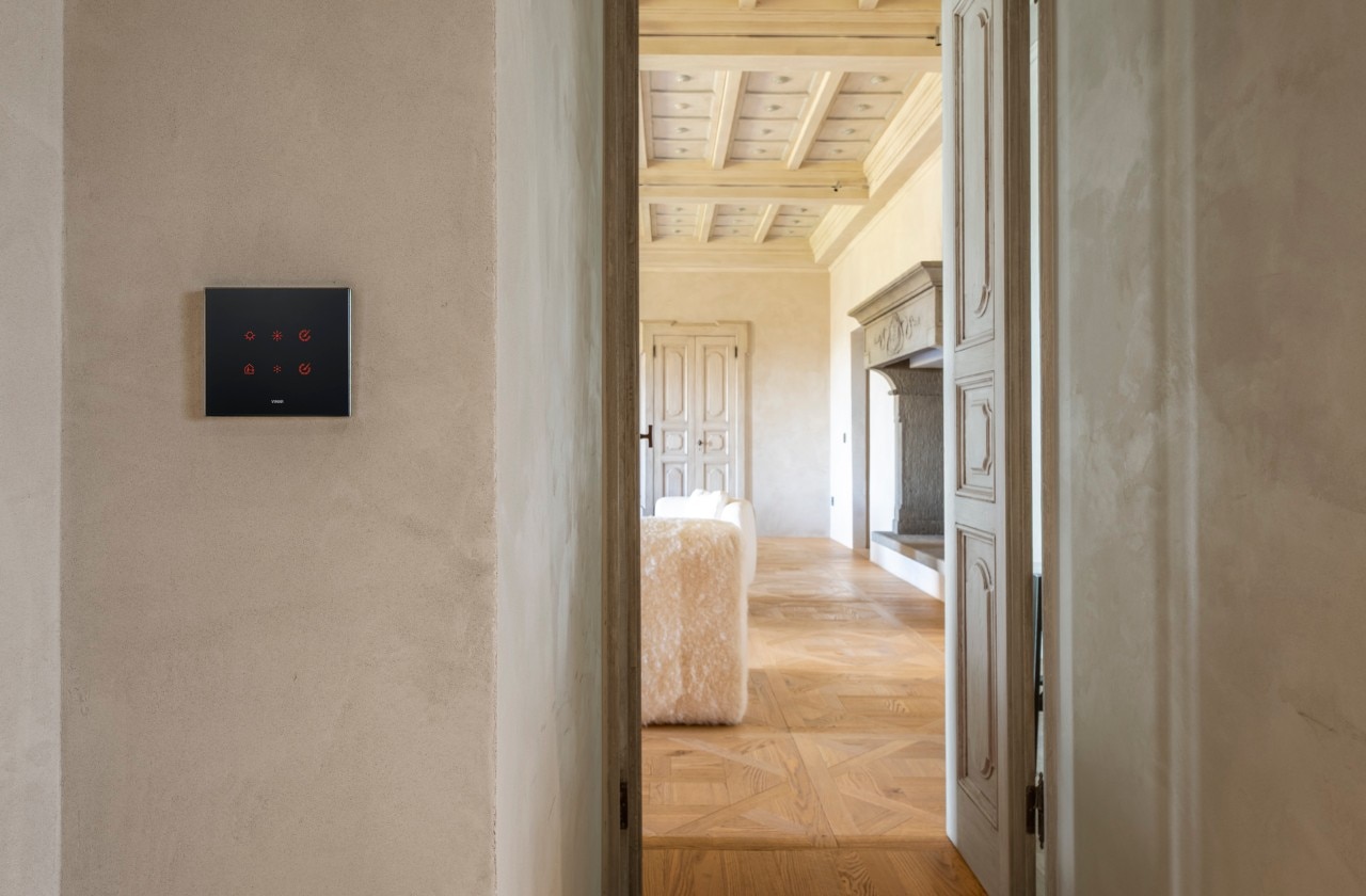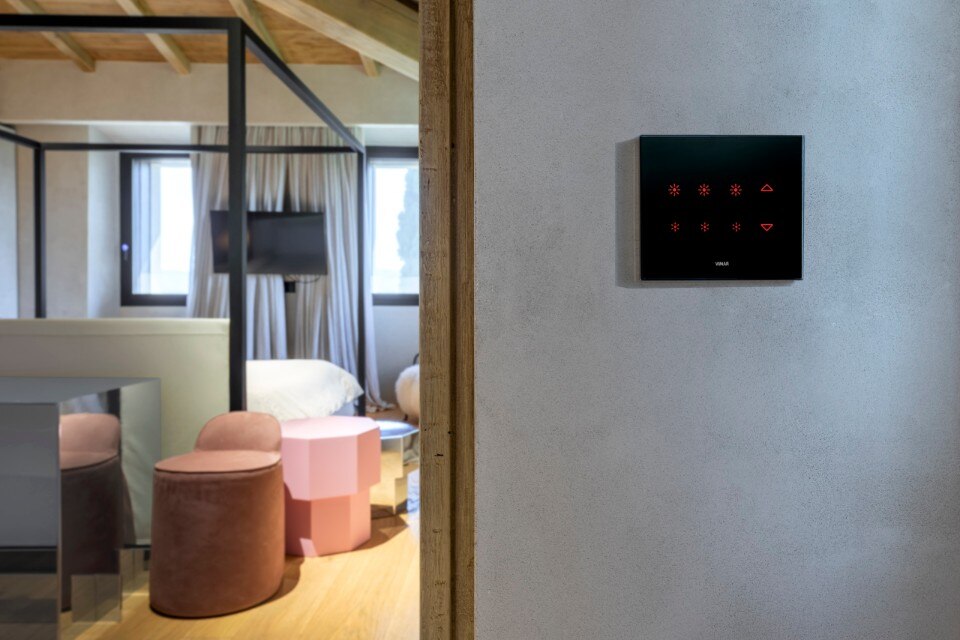 Per gli spazi sono stati utilizzati i dispositivi Eikon Tactil di Vimar, scelti per il controllo dell’illuminazione e della movimentazione di tende e oscuranti: la superficie di cristallo di questi prodotti, valorizzata da icone a led retroilluminate, si fonde perfettamente nello spazio.