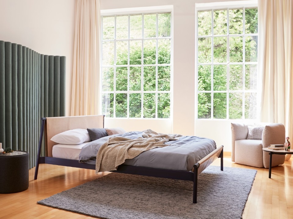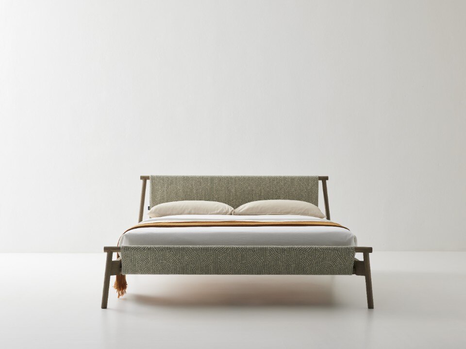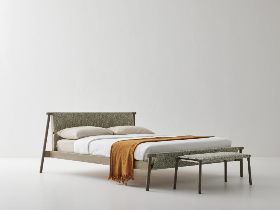 Jack-e si inserisce nel percorso di sostenibilità del brand e, in quest’ottica, i materiali scelti puntano all’ambiente: il legno di frassino provienente da riforestazione è tinto con prodotti naturali mentre testiera e pediera sono valorizzate da tessuti ecosostenibili.