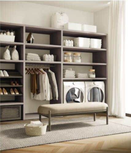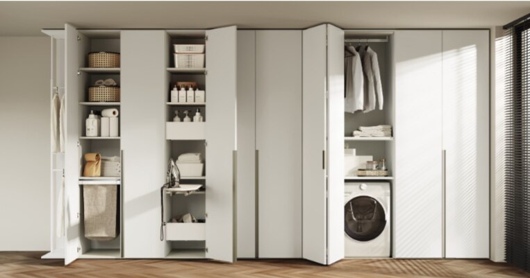 I moduli degli armadi sono personalizzabili in profondità (50, 65, 70 cm) e in altezza (2, 2.35, 2.55 metri) e allo stesso tempo è possibile scegliere la suddivisione interna inserendo cassetti, cesti portabiancheria, assi da stiro estraibili, appendiabiti, dando forma a cabine e spazi attrezzati. A disposizione otto finiture e due tipologie di apertura, a battente o a soffietto.