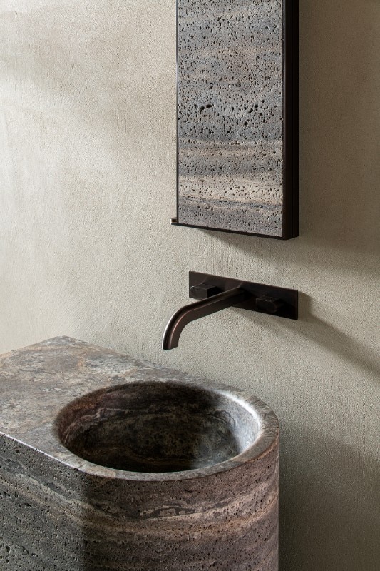 Sixty è formata da rubinetteria e accessori bagno prodotti interamente in acciaio inossidabile e disponibili nell’esclusiva finitura satinata Black Ivory, la cui tonalità rimanda a una delle varietà più pregiate di caffè. Una cromia che ben si adatta alla matericità del Marmo Travertino Titanio che distinue la specchiera e il lavabo monolitico progettati dal designer belga.
