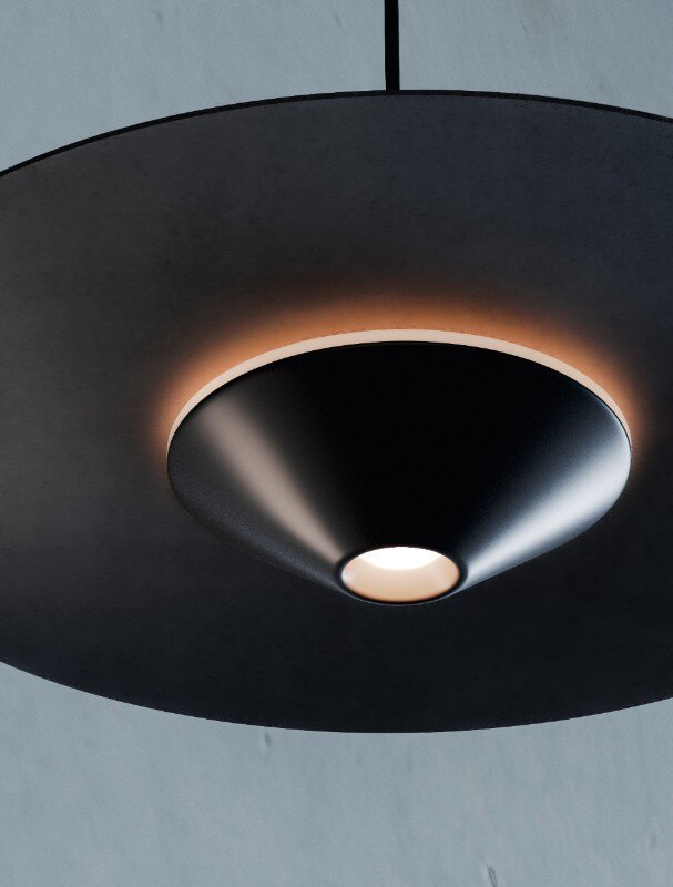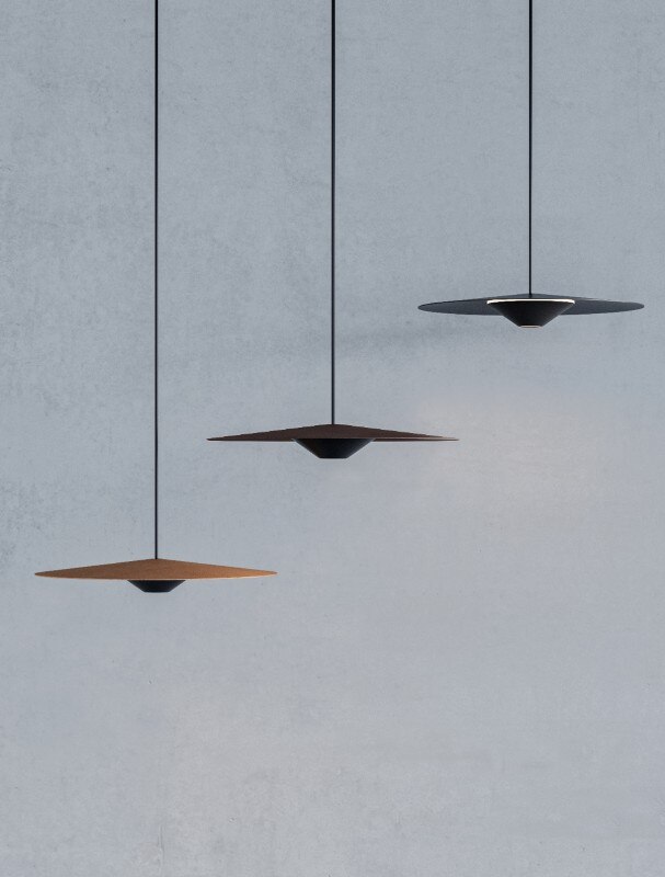 La lampada a sospensione U.F.O. si distingue per un ampio diffusore in metallo di forma conica dallo spessore sottile. La luce LED proietta un ampio fascio di luce che si riflette fortemente verso il basso, mentre un anello luminoso posto tra il diffusore e la sorgente luminosa emette una luce radente dando l’idea di un oggetto sospeso nell’aria. La lampada è disponibile nei diametri 35 o 60 centmetri e nelle finiture Black, Rust e Sand.