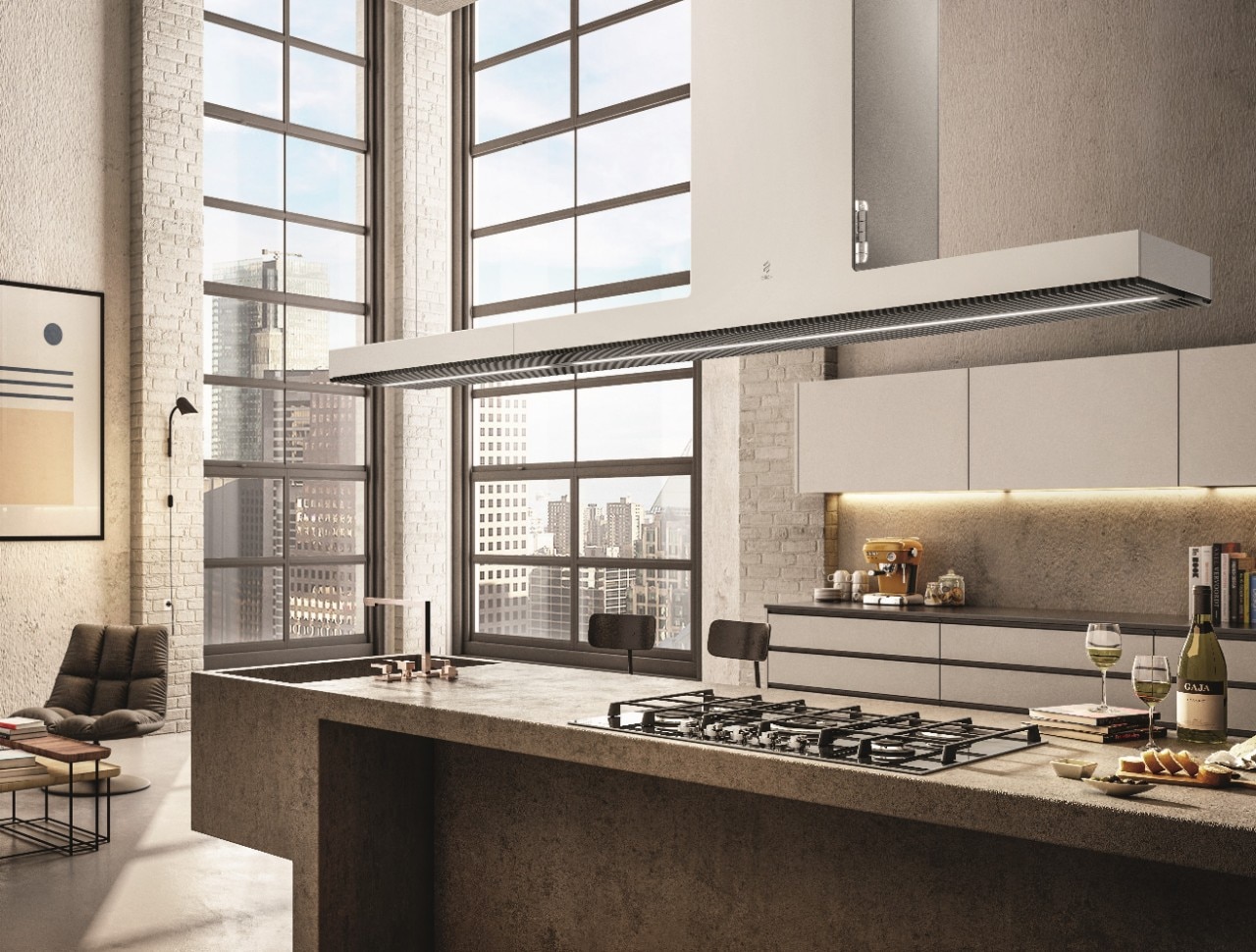 L’illuminazione è data invece da una striscia led continua che diffonde la luce, mentre diverse sono le finiture: la cappa può essere scelta in vetro nero temperato ad altissima resistenza e basso contenuto di ferro, in KRION® – una superficie calda al tatto, durevole, resistente e facile da pulire, ottimale per prevenire la formazione di batteri – oppure nella versione in acciaio inox.