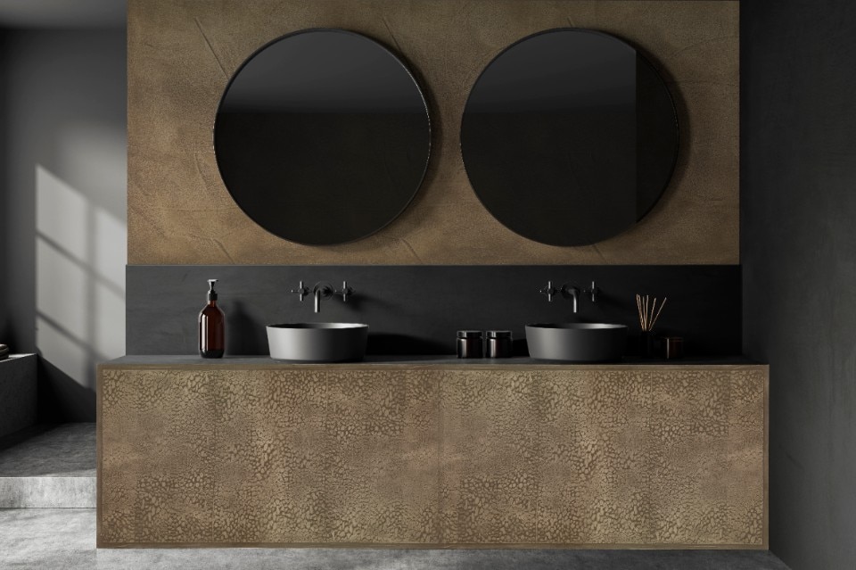L’effetto metallo invece è garantito da Plamina, finitura per ambienti interni pensata per produrre il calore del bronzo, la brillantezza dell’ottone e la lucentezza del rame. Applicabile su pareti, soffitti e complementi indoor, questo rivestimento si distingue per la sua base ad acqua, per i leganti privi di solventi e le pregiate polveri metalliche.