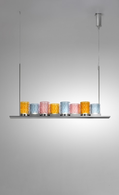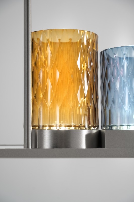 Fra le nuove ideazioni, si trovano la sospensione Galatea, progettata da Studio Mamo: la struttura in finitura argento satinato mantiene sospesa come su un’altalena la composizione di paralumi in cristallo intagliato, in un equilibrio tra linee pulite e materiali preziosi.