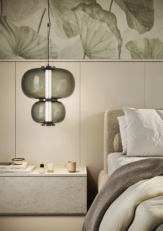 La collezione Nube, disegnata da Defne Koz, si amplia in una nuova versione a sospensione todenggiante. Tra tradizione e innovazione, la lampada ospita al suo interno un diffusore in cristallo inciso, mentre l’esterno in volumi di vetro muranese risulta declinabile in tre colorazioni trasparenti come blu avio, rosa salmone e fumé.