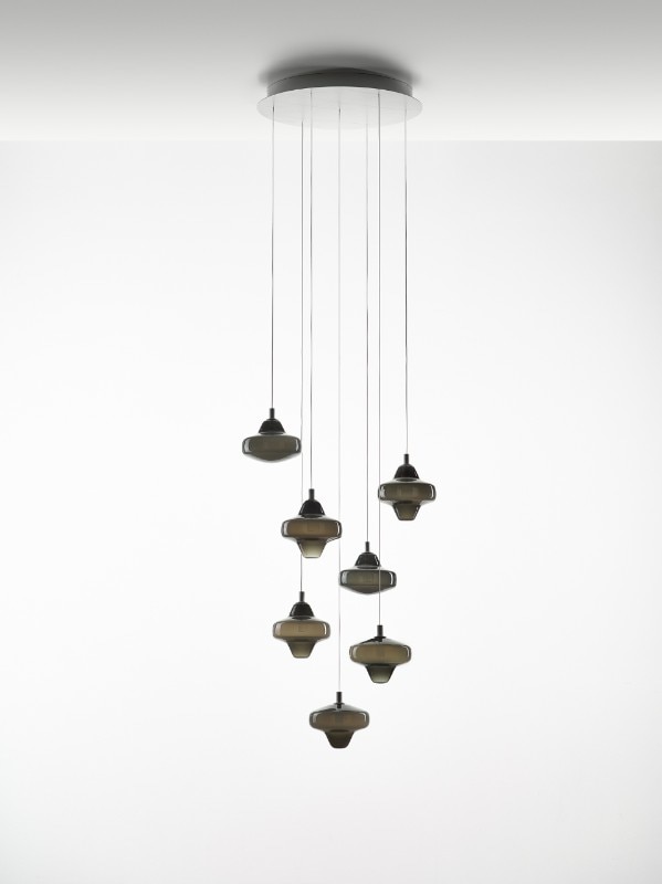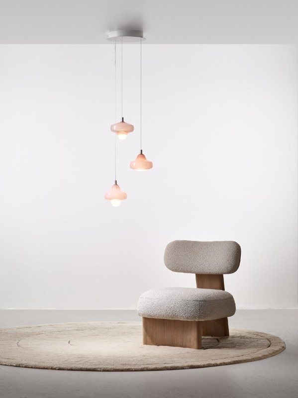 I paralumi sono realizzati in vetro lavorato artigianalmente e sospesi su cavi sottili di varie lunghezze, realizzati nelle tre varianti opalino opaco, opalino rosa perla e opalino grigio perla.