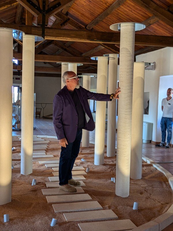 Formata da 15 colonne rivestite di pittura a base di sughero dalle diverse texture, l’opera è valorizzata da 55 cordoli e da 23 mattonelle, realizzate nella malta a base di sughero di Diasen.