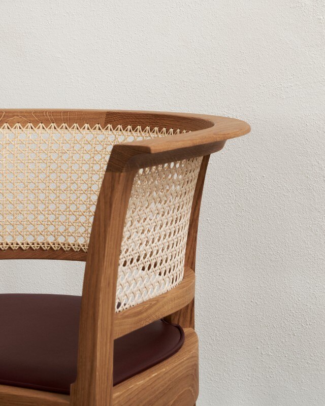 La sedia di Carl Hansen & Son si distingue per gambe snelle che si assottigliano verso la base e per uno schienale sinuoso e semicircolare che si estende dando forma a un bracciolo flessuoso. La sedia è stata originariamente realizzata con seduta, lati e schienale in rattan francese mentre dal 1964 è stata prodotta con seduta rivestita in pelle o tessuto.