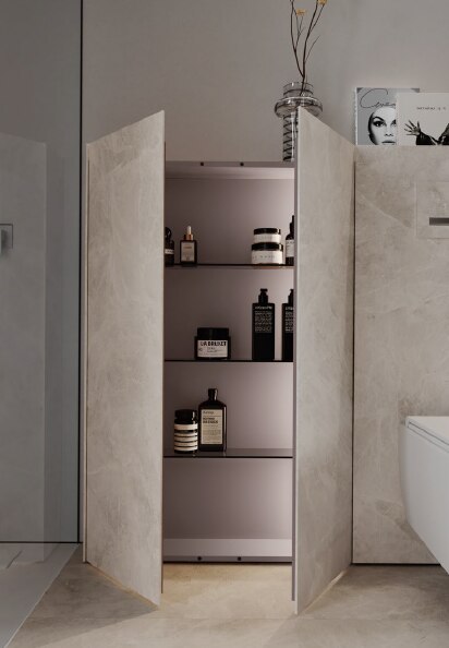 Il sistema Wall è proposto nelle finiture Rovere e Grès, ma anche in laccati opachi, lucidi e metal su finitura liscia e in laccati opachi su finitura rovere a poro aperto. Nella soluzione a pensile le ante possono essere realizzate in vetro Fumé o caratterizzate da una “lavorazione a quadretti” che cela alla vista gli oggetti personali. Wall è valorizzato anche da un sistema di appoggio per aggiungere praticità.