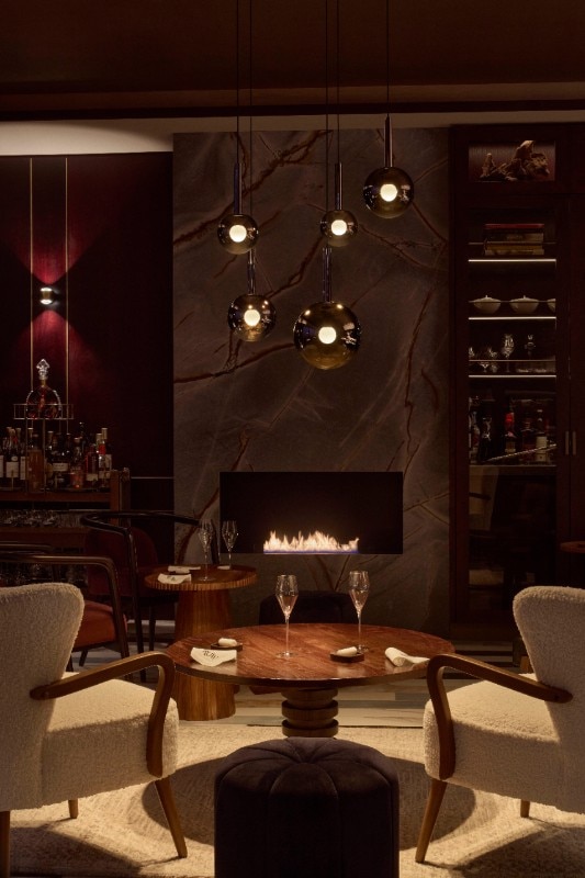Il ristorante si sviluppa su due livelli, ciascuno con un ambiente a sé. Il piano terra è caratterizzato da un'eleganza raffinata: tavoli raccolti, sedute confortevoli e un imponente bar, avvolto in una luce calda da elementi Mito sospeso istallati a gruppi che evocano l'atmosfera intima del camino acceso.
