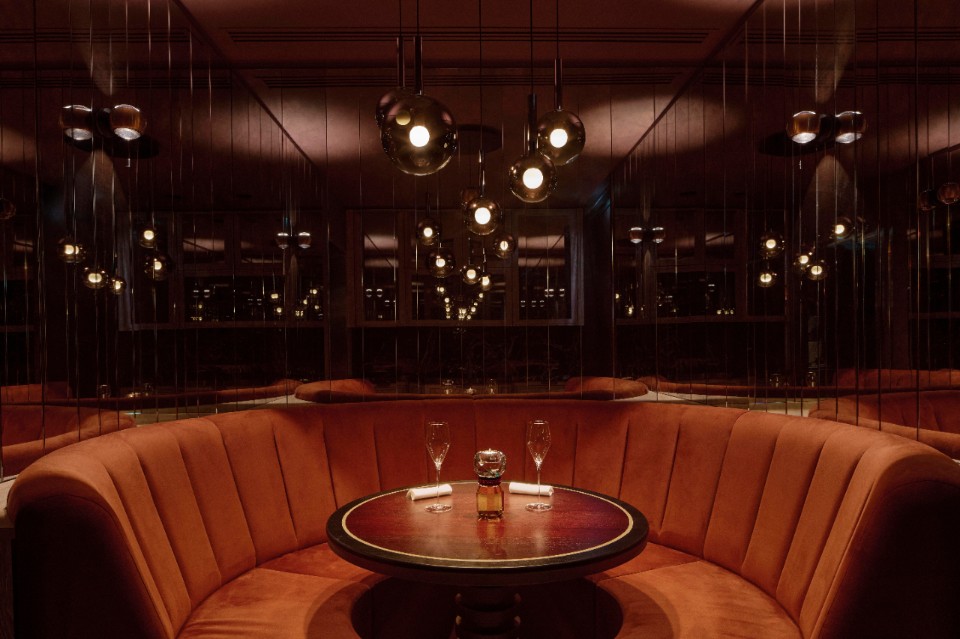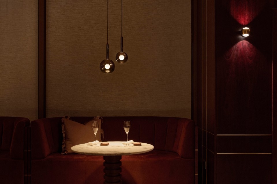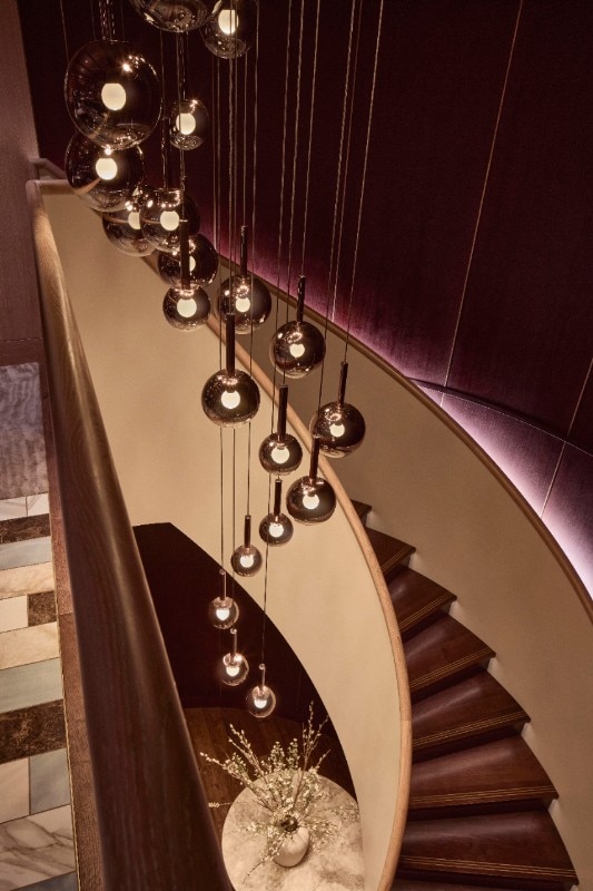 Il lampadario chandelier Luna sospeso a forma di doppia elica che fluttua sopra la sinuosa scala a chiocciola crea continuità tra i due piani. Questa imponente installazione luminosa accompagna gli ospiti al piano inferiore caratterizzato da un’atmosfera lounge dove gustare il relax e continuare l’esclusiva esperienza gastronomica.