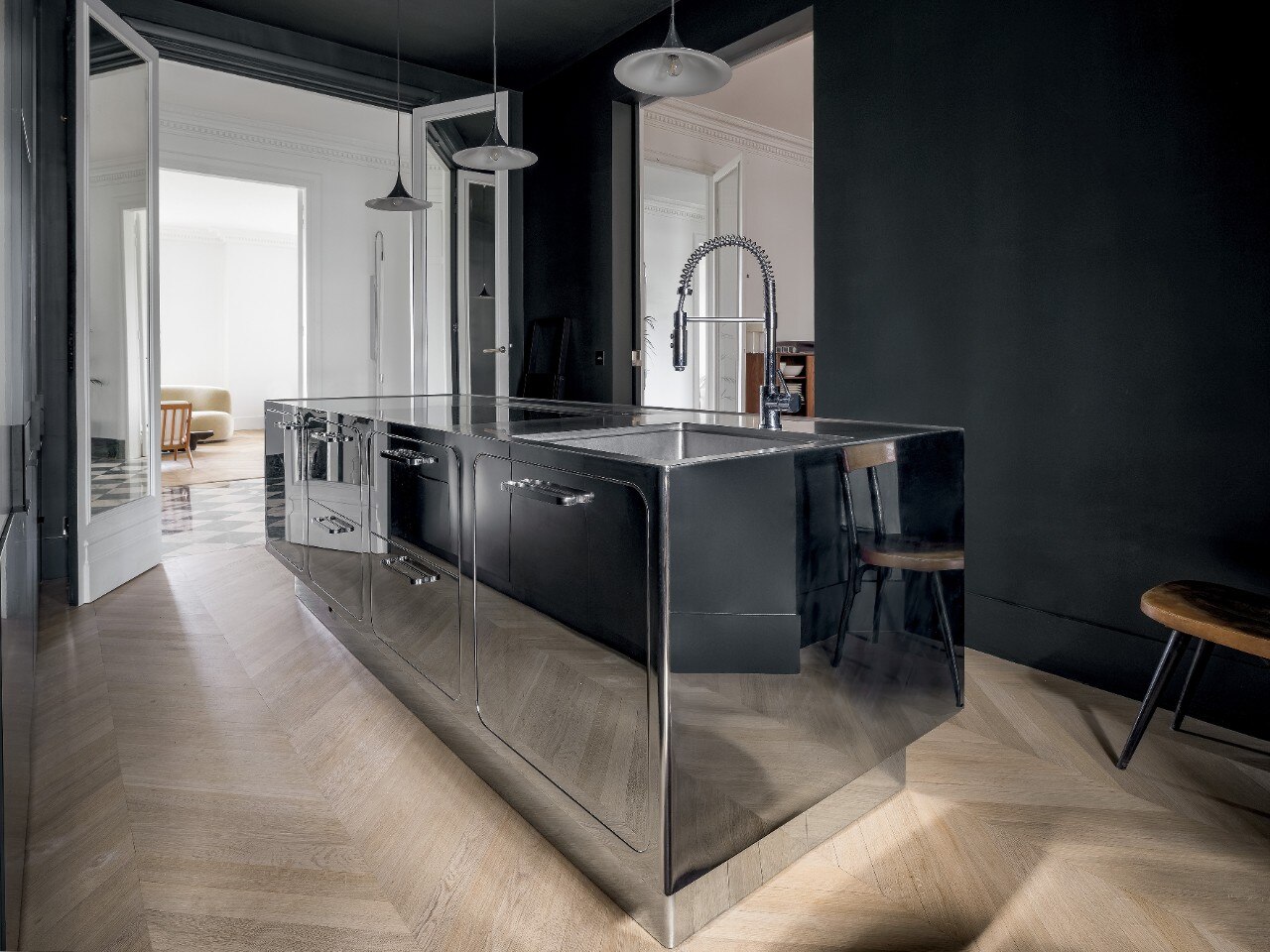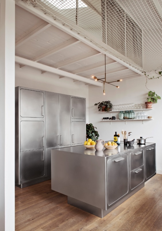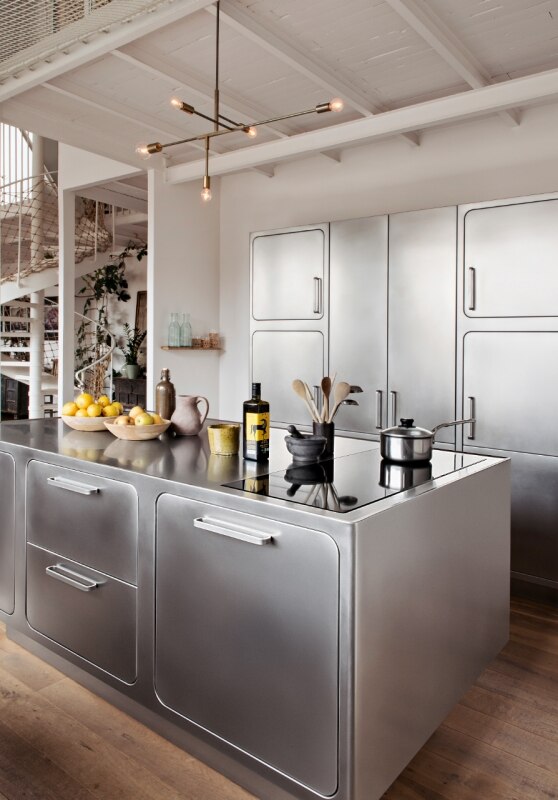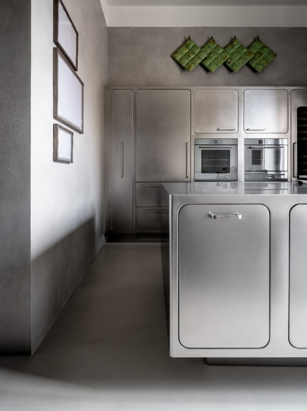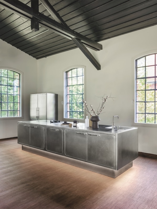 Una cucina realizzata in acciaio inox AISI 304, un materiale resistente alla corrosione e a temperature elevate, adatto al contatto con gli alimenti. Nella linea Ego di Abimis lo troviamo disponibile in finitura orbitata a mano, lucida a specchio, verniciata lucida e opaca con colori RAL.