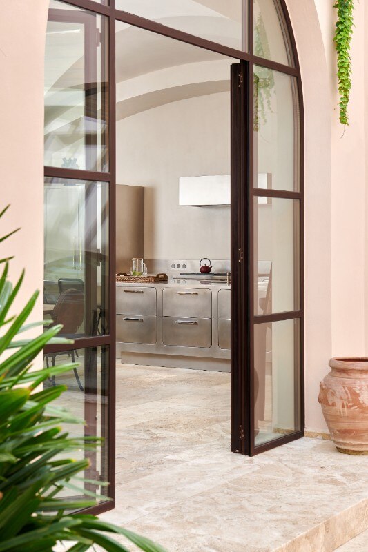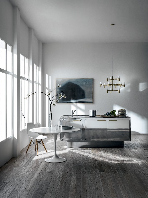 La cerniera cardine è completamente invisibile su brevetto di Abimis, e inossidabile. Le maniglie sono arrotondate, disponibili in acciaio o a contrasto in ottone lucido o opaco, infine il piano integrato è privo di fughe e con bordo rialzato anti-sgocciolio.