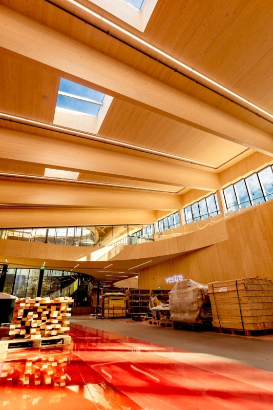 Questo edificio dalla forma inconfondibile è stato costruito secondo lo standard della casa passiva. Ciò significa che il suo fabbisogno energetico è coperto in gran parte dall’energia solare e dal calore generato dai macchinari e dalle persone al suo interno. I progettisti si sono misurati con le grandi sfide del nostro tempo: i cambiamenti climatici e la perdita di biodiversità. L’azienda industriale Vestre desidera assumere un ruolo pionieristico e dare il buon esempio attraverso un uso sostenibile delle risorse naturali.