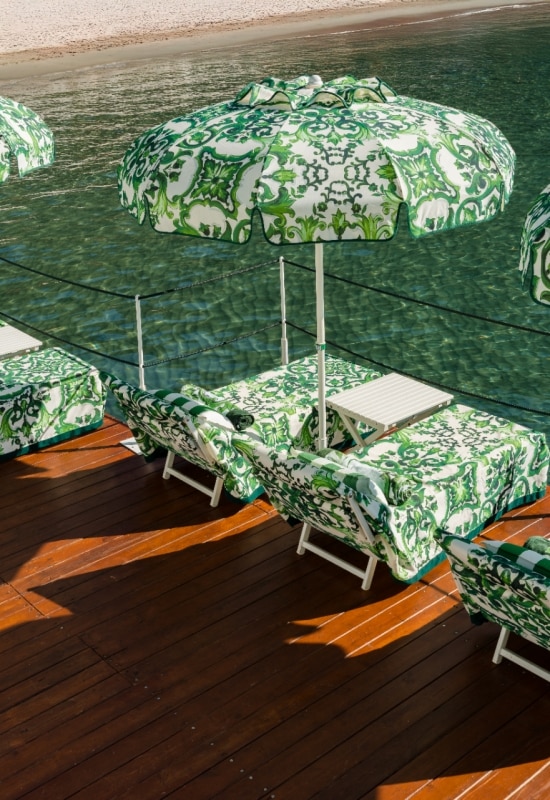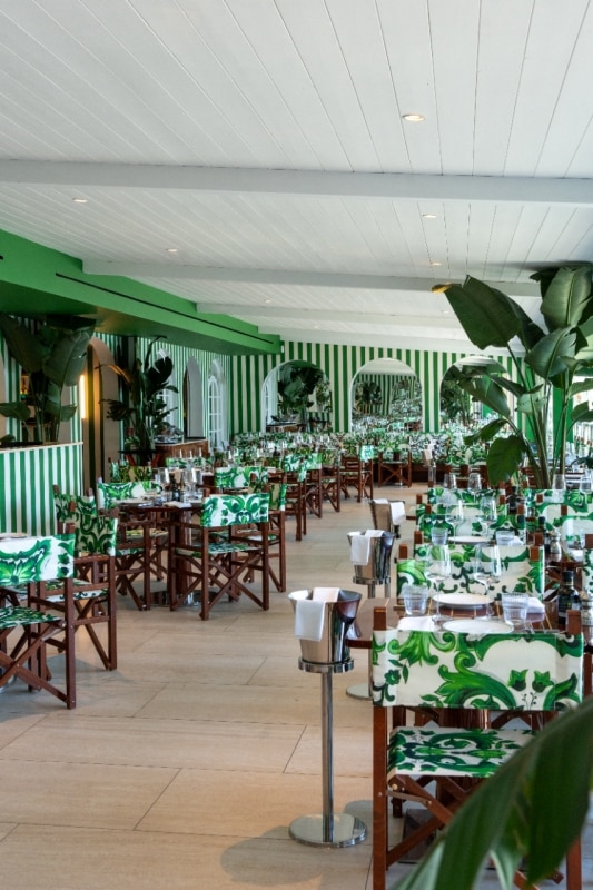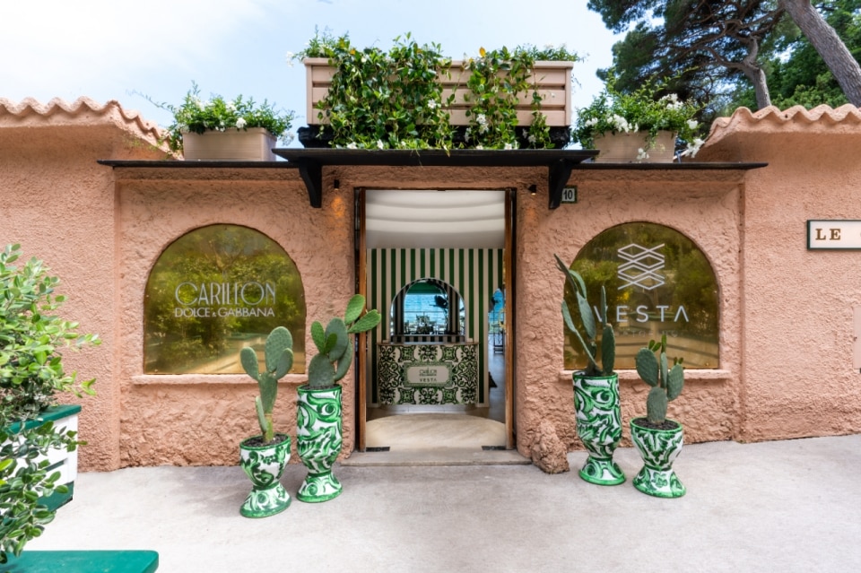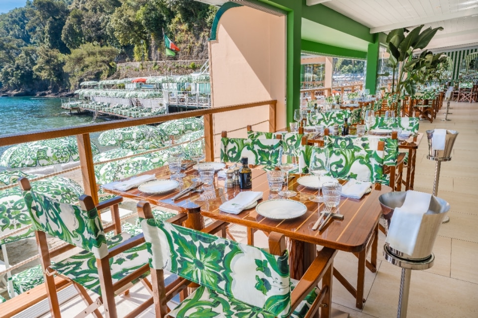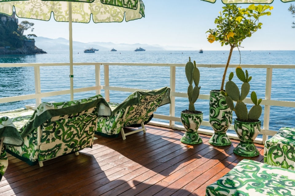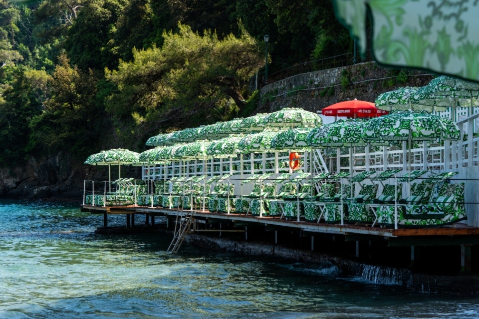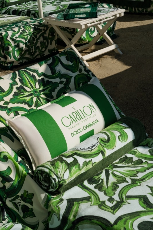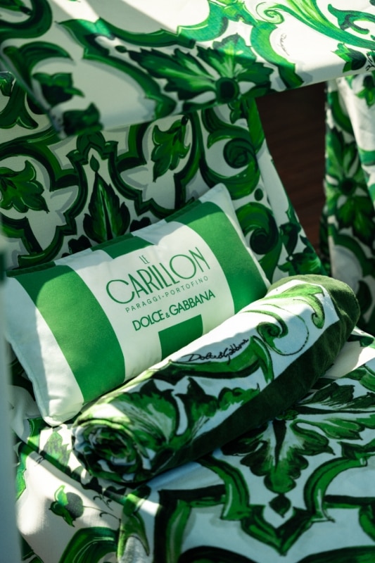 Qui, tra il profumo della macchia mediterranea e il suono delle onde, sorge il beach club Le Carillon, che si tinge con le tonalità del bianco e del verde intenso. La stampa Verde Maiolica di Dolce&Gabbana riveste l’area del beach club, mentre il motivo a righe verticali decora la zona bar, il ristorante Vesta Portofino e l’esclusivo pop-up, riportando alla mente alle atmosfere vacanziere della Riviera.