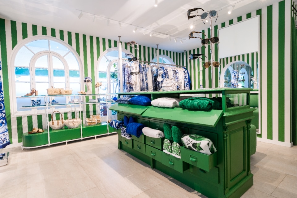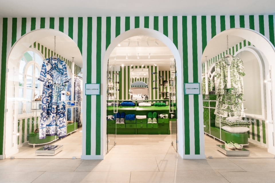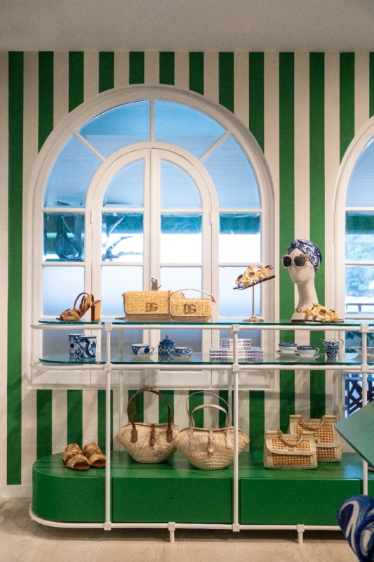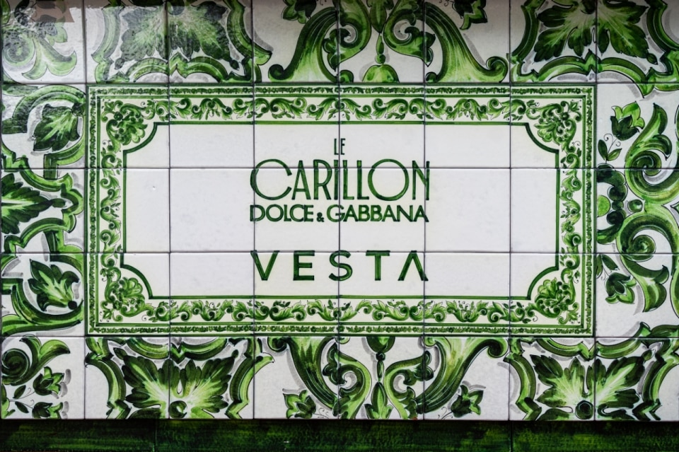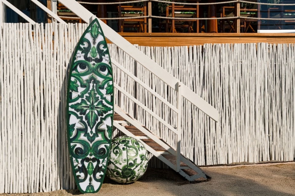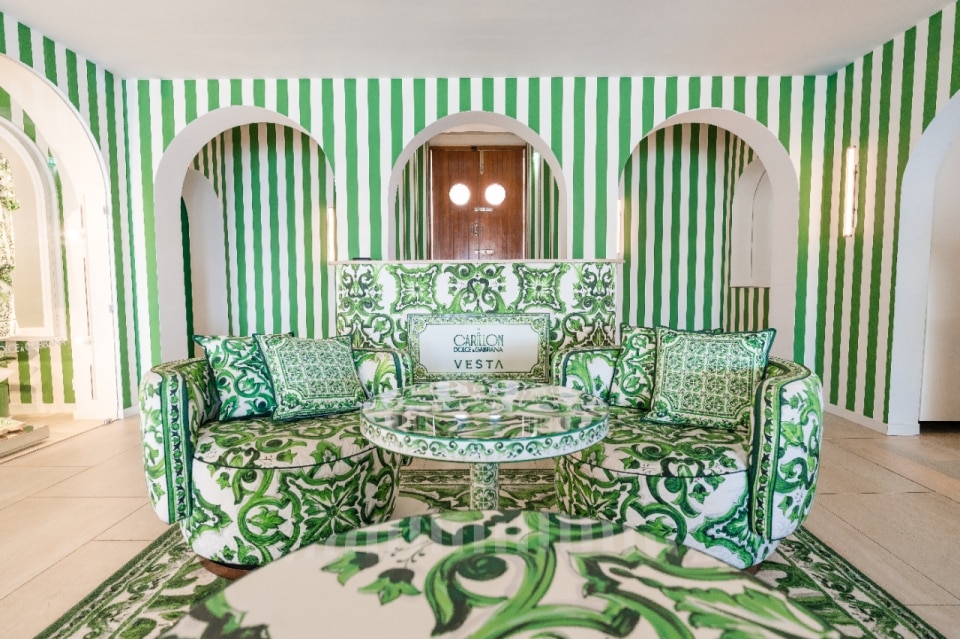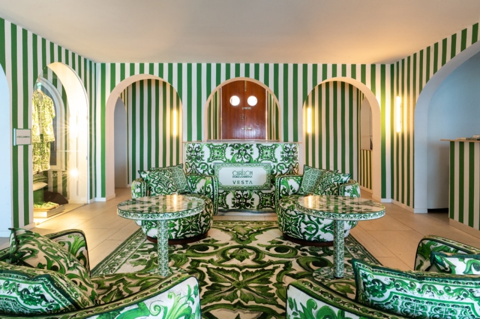 Qui, tra il profumo della macchia mediterranea e il suono delle onde, sorge il beach club Le Carillon, che si tinge con le tonalità del bianco e del verde intenso. La stampa Verde Maiolica di Dolce&Gabbana riveste l’area del beach club, mentre il motivo a righe verticali decora la zona bar, il ristorante Vesta Portofino e l’esclusivo pop-up, riportando alla mente alle atmosfere vacanziere della Riviera.