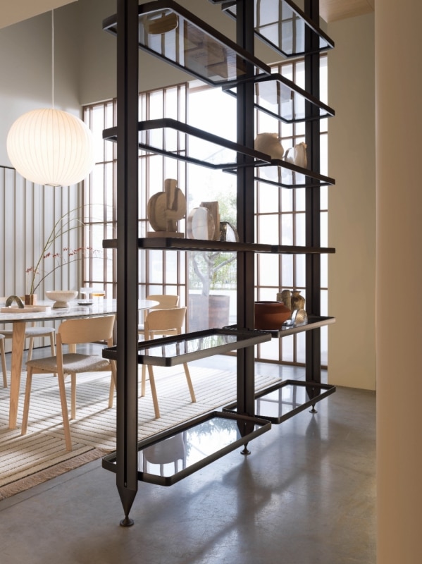 o terra-cielo, combina montanti verticali in alluminio con ripiani orizzontali in diversi materiali, incorniciati con un telaio in alluminio laccato.