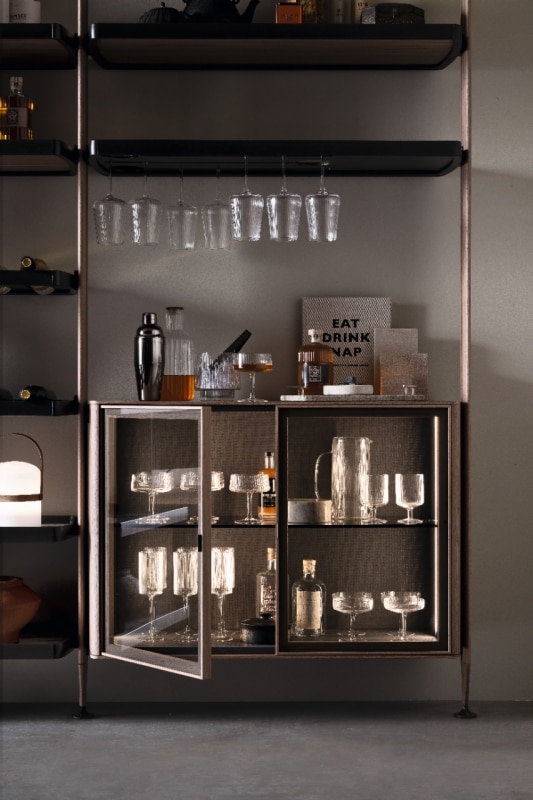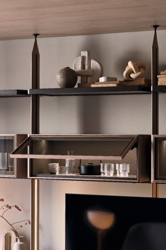 La grande possibilità di scelta dei materiali, elemento cardine di tutte le collezioni Novamobili, consente di dare una forte impronta stilistica alla parete: moderna e minimal con la struttura brunita e i ripiani in vetro, calda e accogliente grazie agli elementi di impiallacciato in rovere chiaro. Ma anche classica ed elegante grazie alla scelta del rovere carbone.