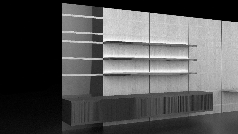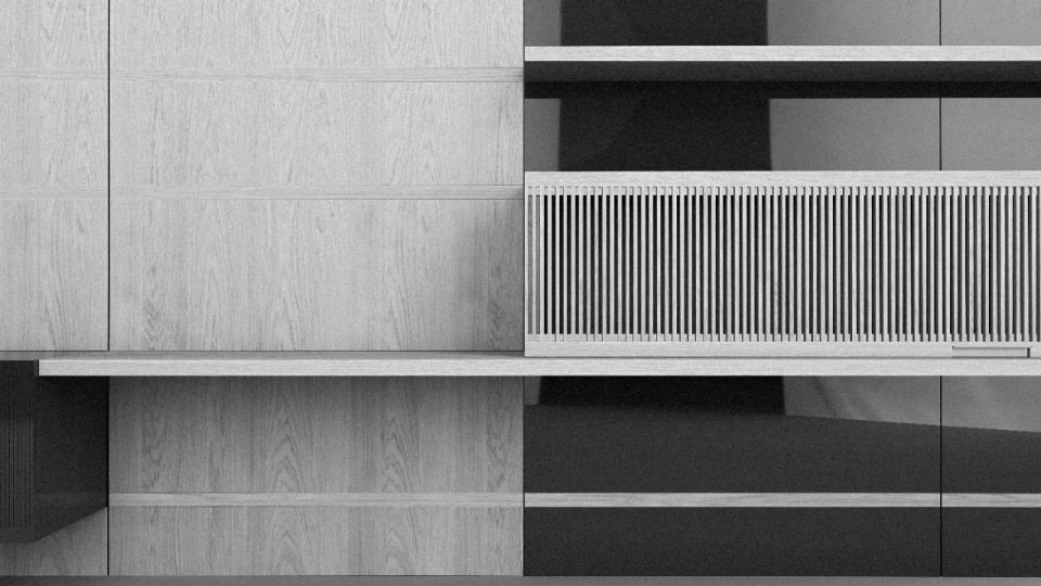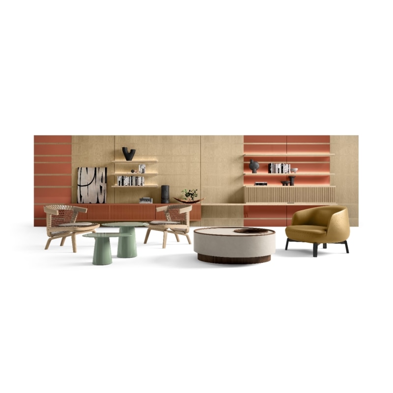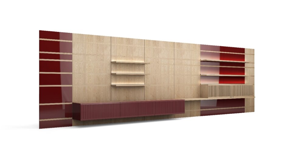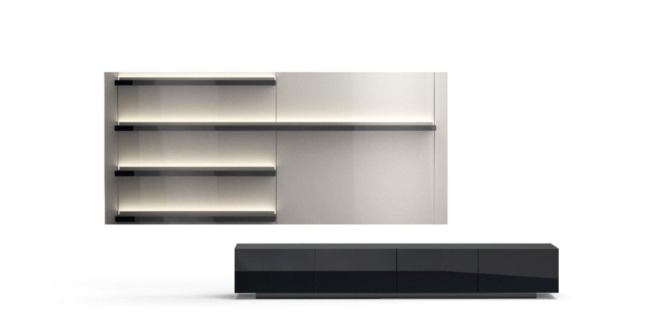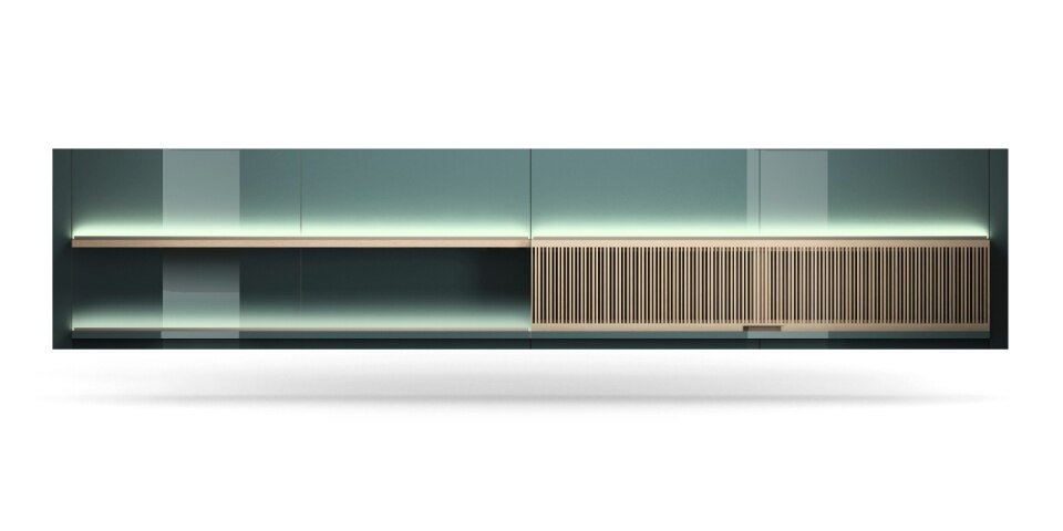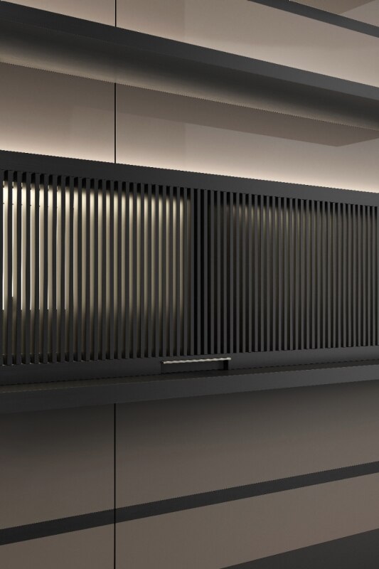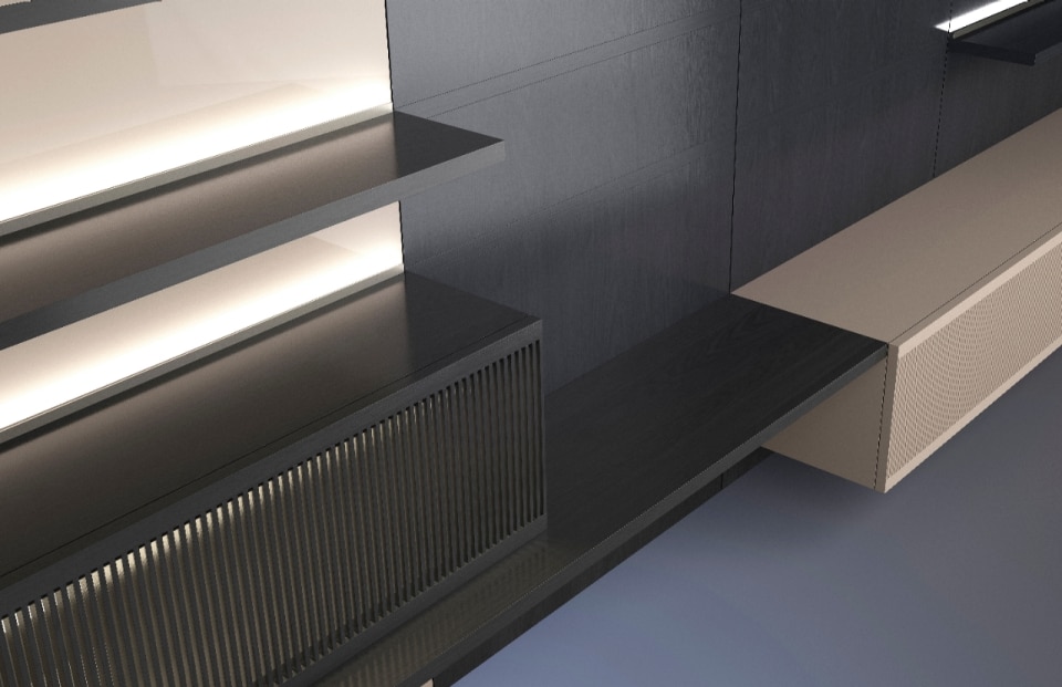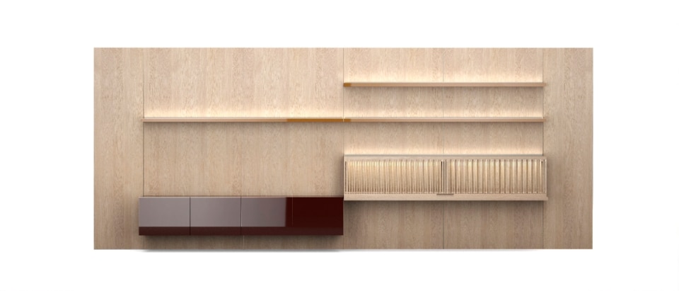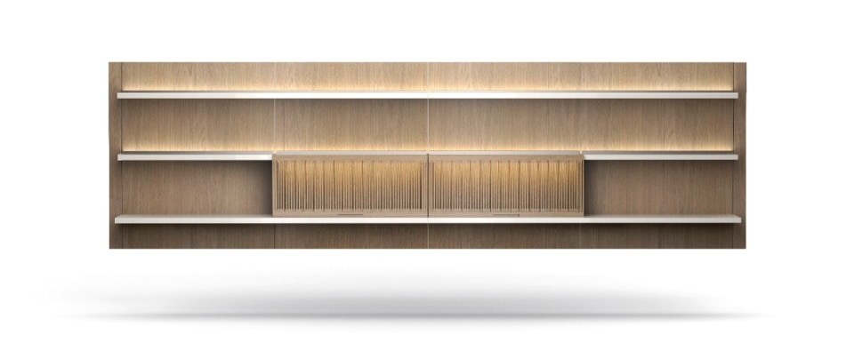 Su questa base si possono posizionare complementi dalle molteplici potenzialità estetiche e funzionali. A partire dai box, caratterizzati da ante con due diversi frontali. Il primo, con bacchette di legno verticali che creano un ritmato “vedo-non-vedo”, e la possibilità di essere retro-illuminate. La seconda soluzione invece presenta il frontale compatto in lacca opaca, dalla superficie a fraseggio grafico di solchi verticali che si traducono in una filigrana chiaroscuro.
