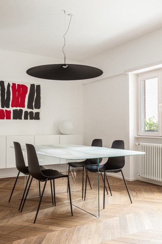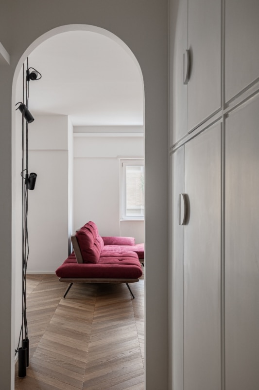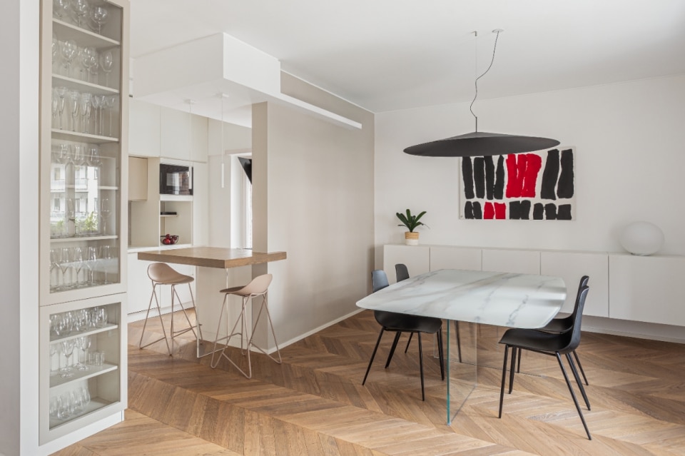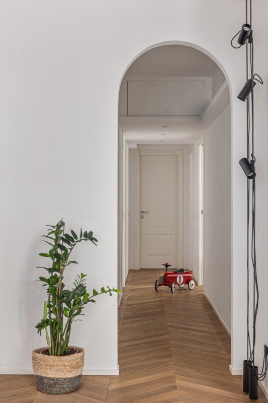 L'identità dell’appartamento trova il suo fulcro nel pavimento in legno, posato a spina ungherese. La forte direzionalità del disegno guida lo sguardo lungo tutto lo spazio, accompagnandolo verso la zona notte, introdotta da un elegante varco ad arco che amplifica la percezione di continuità.