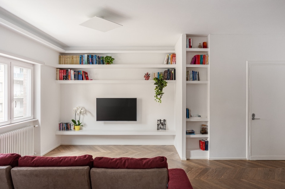 Al centro dell'area living domina un grande divano color porpora, elemento scenico che rompe la neutralità dello spazio e ne accentua la profondità visiva. Le librerie incassate, progettate come estensione diretta della parete, creano un dialogo tra architettura e arredo, offrendo luoghi di esposizione discreti ma caratterizzanti.