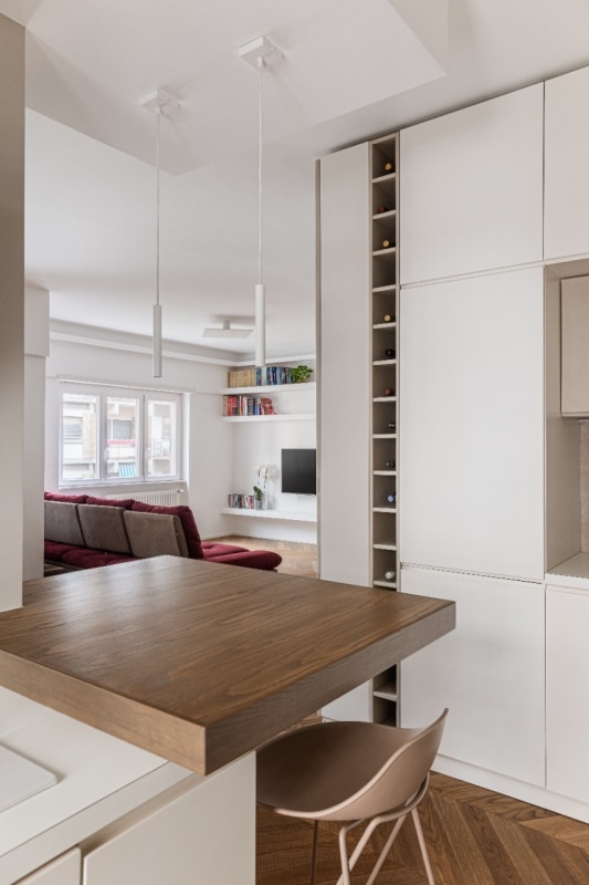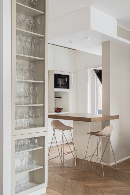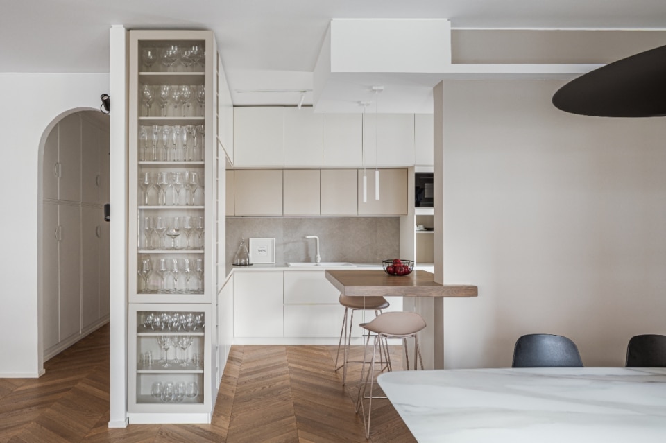 La cucina, pensata come ambiente connesso e al tempo stesso autonomo, si apre sulla zona giorno attraverso un layout funzionale. Il bancone snack in rovere, in continuità cromatica con il pavimento, diventa una soglia naturale tra i due ambienti. A completare la composizione, una colonna-vetrina a tutt’altezza funge da elemento scenografico, trasformando una funzione pratica in un gesto estetico che ricorda un cabinet de curiosités domestico.