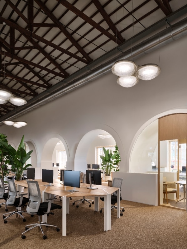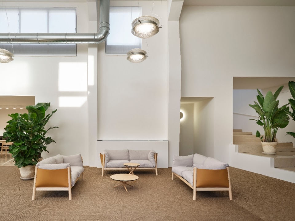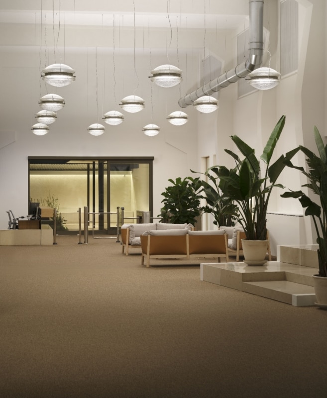 La luce, naturale e artificiale, diventa un elemento progettuale centrale. Per gli alti soffitti degli uffici, nasce Baryon, lampada disegnata da De Amicis e realizzata da OLEV in Veneto. Un corpo illuminante potente e decorativo, pensato per superare la neutralità della luce tecnica. Il vetro soffiato a bocca, costellato di microbolle dorate, filtra il fascio luminoso rendendolo intenso ma gentile, conforme alle normative per i videoterminali e capace di offrire un comfort visivo elevato. Un oggetto che unisce performance e gesto artigianale, completando il racconto di uno spazio dove tradizione, innovazione e atmosfera convivono con naturalezza.