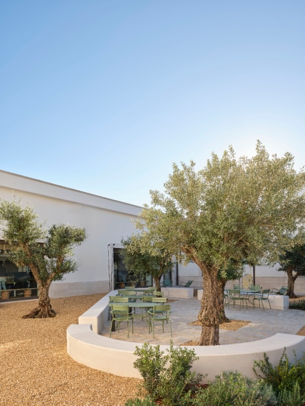 Gli architetti valorizzano gli elementi originari dell’edificio attraverso un uso calibrato di materiali locali — pietra di Trani, legni naturali, cotti lavorati a mano, tessuti tradizionali — richiamando la ricchezza artigianale pugliese. Le connessioni verticali, pensate come luoghi di relazione indipendenti, scandiscono la distribuzione degli ambienti. A questa geografia materica si aggiunge una presenza diffusa del verde, che avvicina interno ed esterno in una continuità visiva e climatica. Le dotazioni tecnologiche, integrate con discrezione, restituiscono un equilibrio tra innovazione e tradizione, mentre gli standard energetici e i criteri ESG guidano l’intero intervento, affidato in larga parte a imprese locali.