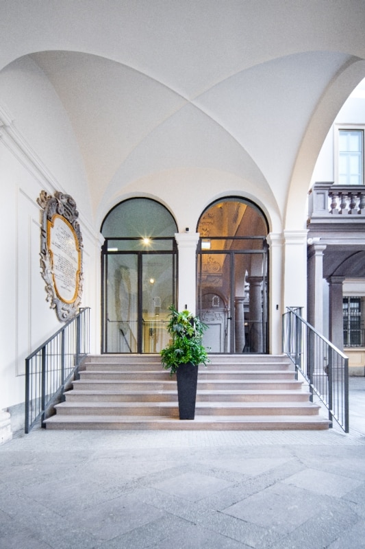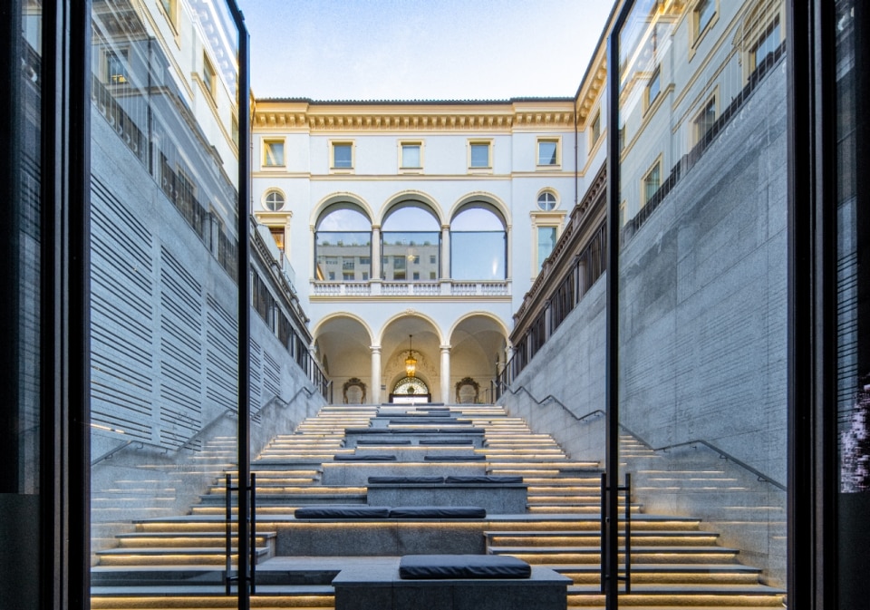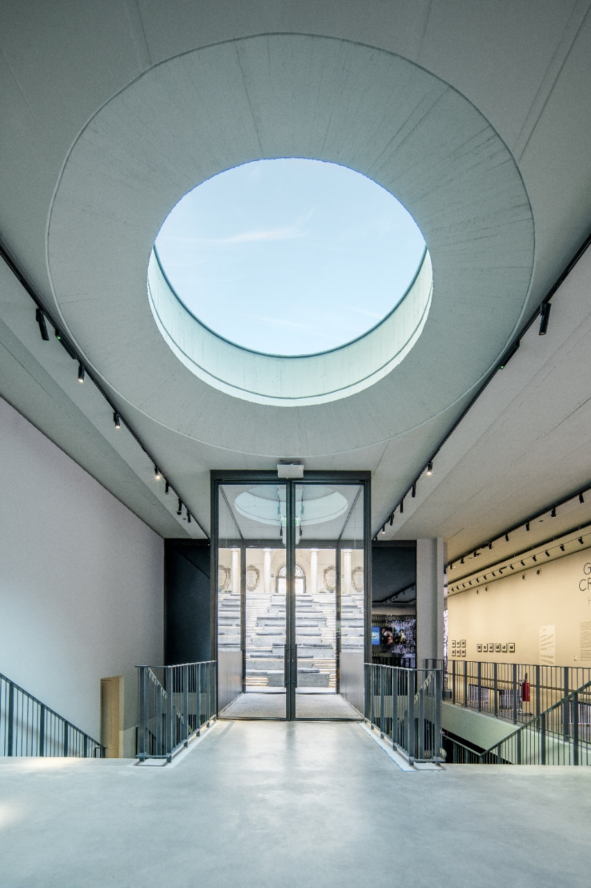 Il cuore di questa nuova relazione è lo scalone monumentale che connette la piazza alle sale sotterranee. La sua conformazione a tribuna lo rende spazio di incontro e socialità, mentre il lucernario circolare calpestabile porta luce zenitale direttamente alla hall di ingresso. La corte interna, un tempo riservata all’uso privato della banca, diventa ora piazza aperta, accesso al museo e luogo di servizi e funzioni pubbliche, dal bookshop al caffè, dal ristorante San Carlo al Digital Lab.