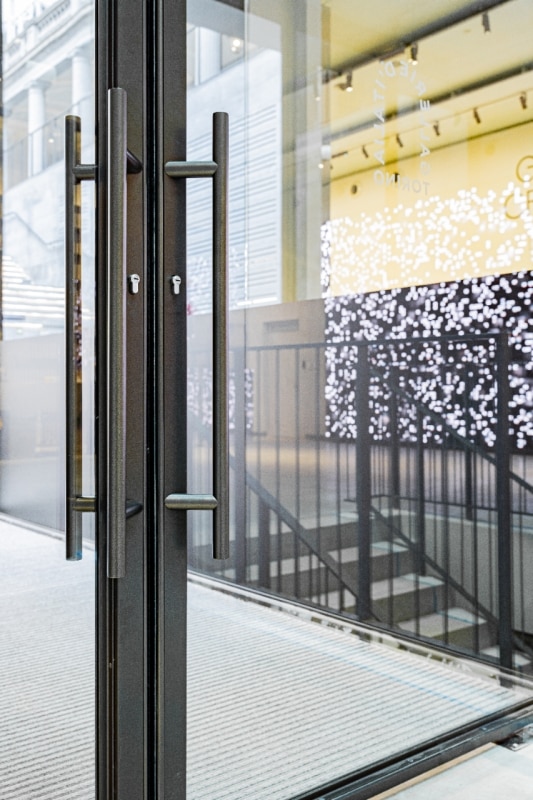 Il sistema OS2 75 in acciaio zincato verniciato definisce le grandi aperture a tutta altezza dell’ingresso e le geometrie ad arco dei piani nobili. La sua presenza si integra con le cromie del progetto, dialoga con la pietra e con gli altri materiali, e consente ampie superfici vetrate grazie allo spessore ridotto dei profili, anche nel caso di ante di grandi dimensioni. Il colore scuro e le linee essenziali richiamano i serramenti storici in ferro, mentre la precisione costruttiva e le prestazioni tecniche collocano il sistema in una dimensione pienamente contemporanea.