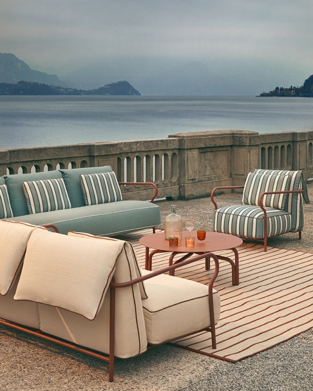 La collezione comprende poltrone lounge e da pranzo, divani a due e tre posti, tavoli, lettini e tavolini da caffè. Sedie e lettini sono impilabili, una scelta pensata per garantire massima funzionalità e rispondere alle esigenze dell’hospitality. La struttura in alluminio ultraleggero è proposta in tonalità naturali come terracotta, grafite, salvia e sabbia, colori che rimandano ai riflessi dell’acqua e alle sfumature della terra.