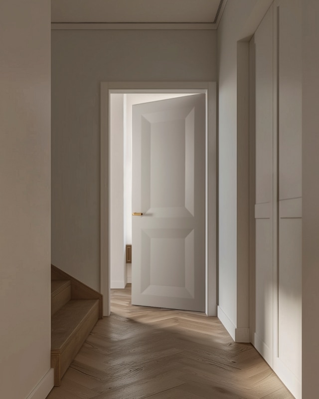 Il legno, materiale fondativo dell’identità di Effebiquattro, resta protagonista. Viene affiancato dal vetro satinato, elemento tipico dell’epoca, che introduce luce e profondità visiva, trasformando la porta in una superficie permeabile, capace di mettere in relazione gli ambienti. Nessuna decorazione superflua, nessuna concessione all’ornamento: Palestro punta su linee rette, proporzioni armoniose e funzionalità, in piena coerenza con il pensiero razionalista.