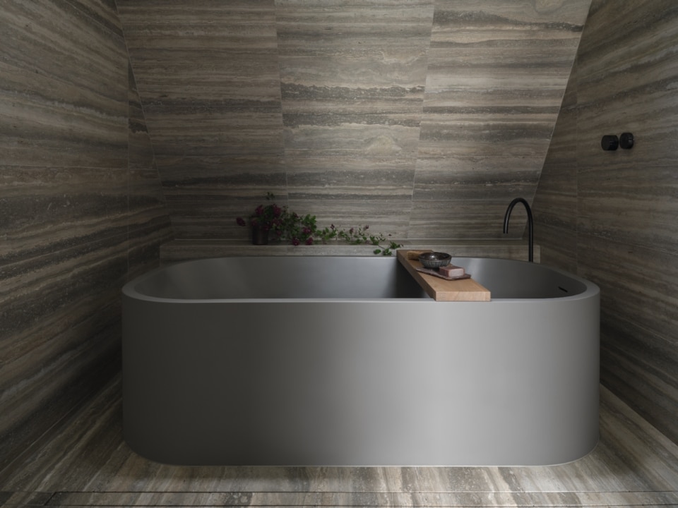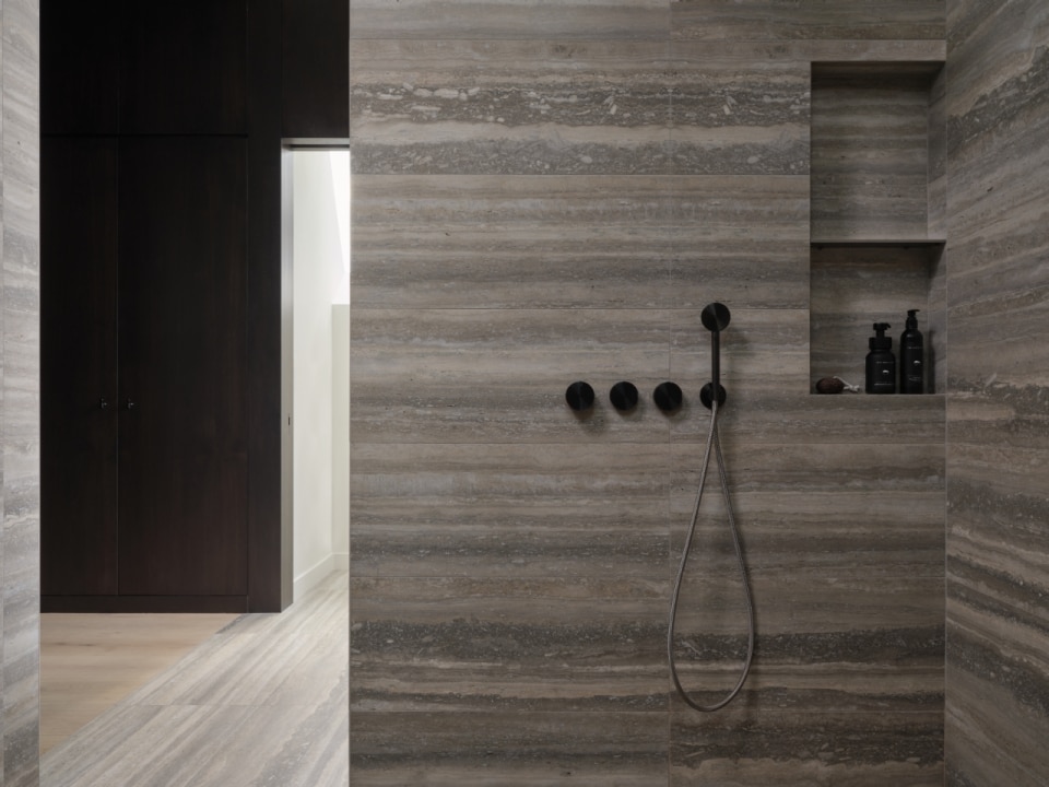 Il travertino ritorna anche negli ambienti bagno, dove rivestimenti e arredi si combinano con la rubinetteria CEA delle collezioni GIOTTO e FREE IDEAS, proposta in finitura Black Diamond satinata. Una scelta che rafforza l’atmosfera sofisticata degli spazi, accentuando il rapporto tra luce, superfici e riflessi, e trasformando il bagno in un’estensione coerente del linguaggio architettonico complessivo.