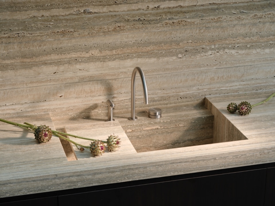 La cucina diventa uno degli spazi chiave di questa narrazione. Qui, il contrasto tra gli arredi in noce tinto e le pareti scure trova un punto di equilibrio nel top in travertino, materiale che introduce una qualità tattile e luminosa. In questo contesto si inserisce la rubinetteria CEA della collezione GIOTTO PLUS in finitura satinata, scelta per la sua capacità di dialogare con l’essenzialità degli elementi senza rinunciare a una presenza scultorea.