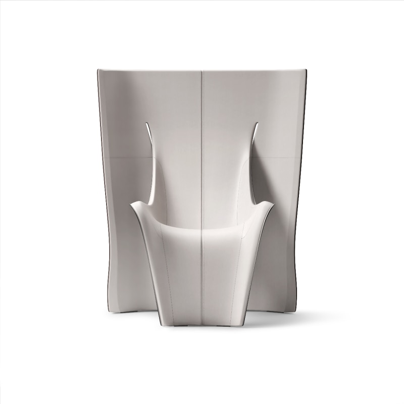 Questo contrasto cromatico non è solo un gioco visivo, ma rappresenta un dialogo tra due forze opposte, simboleggiando tensione e distensione. La pelle, con la sua finitura morbida, sottolinea le curvature e accompagna le forme del corpo umano, rivelando un’esperienza di seduta unica. Quando ci si siede, il corpo viene accolto, ma allo stesso tempo avvolto in una sensazione di sospensione controllata in un equilibrio perfetto.