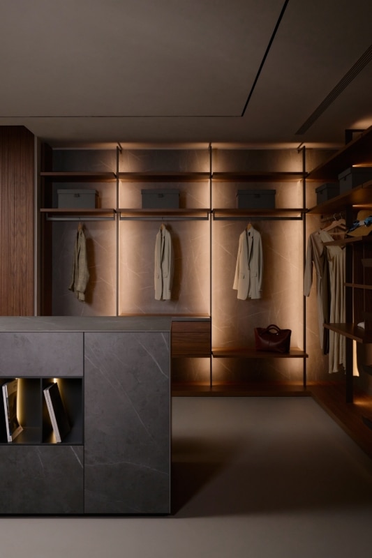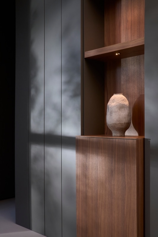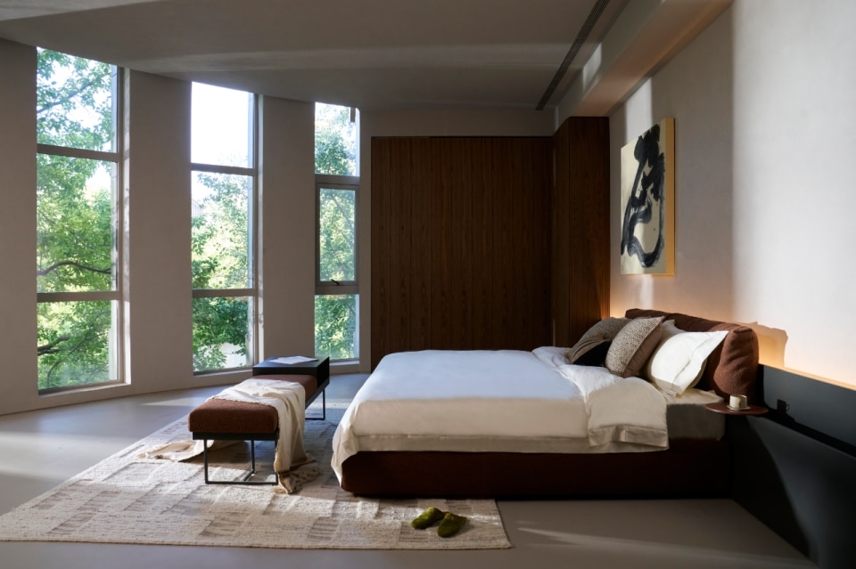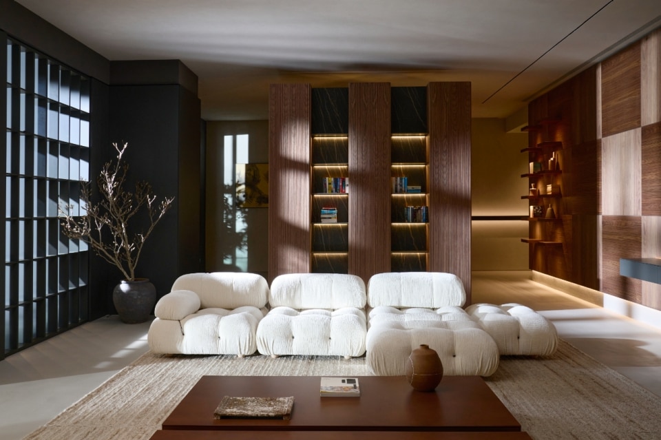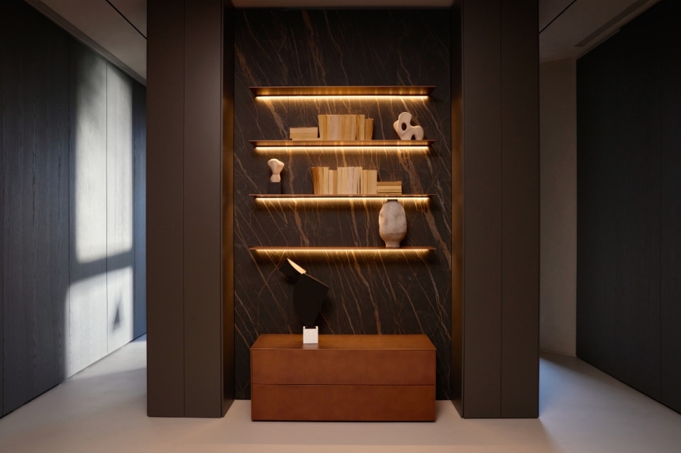 Gli arredi sono progettati per rispondere alle esigenze moderne, combinando estetica e funzionalità, come le superfici di Freedhome e Architype che nascondono funzioni integrate, ottimizzando ogni centimetro di spazio. Le boiserie, che raggiungono anche i quattro metri di altezza, amplificano la sensazione di profondità mentre la luce naturale entra in dialogo con l'ambiente, grazie alle ampie vetrate rivolte verso un giardino interno.