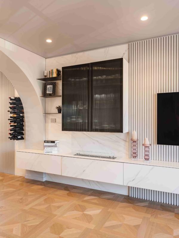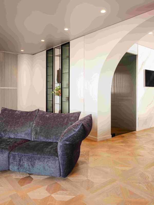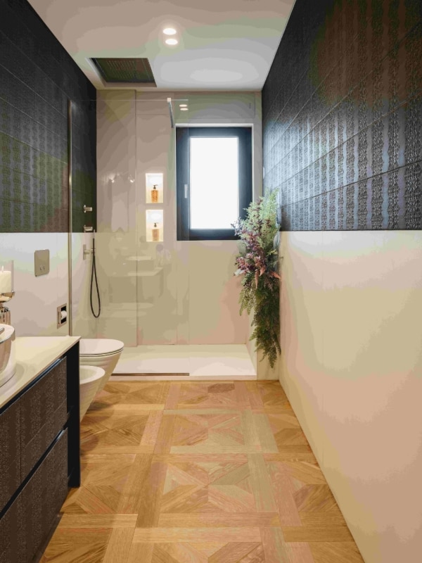 La quadrotta Q2 di Woodco, con le sue dimensioni di 60x60 cm, è un modulo geometrico che gioca con le venature del legno disposte in un pattern radiale e speculare. Questa disposizione crea una composizione che si concentra verso il centro, generando un tappeto ligneo che amplifica visivamente lo spazio e conferisce una struttura definita. L’effetto finale è quello di un pavimento che non solo risponde alle esigenze estetiche, ma che arricchisce e amplia la percezione prospettica dell’ambiente. La tonalità Rovere Vigogna, scelta per il parquet, si sposa perfettamente con la palette neutra delle superfici verticali, creando un perfetto equilibrio cromatico che permette ai complementi d’arredo, dai toni scuri, di risaltare.
