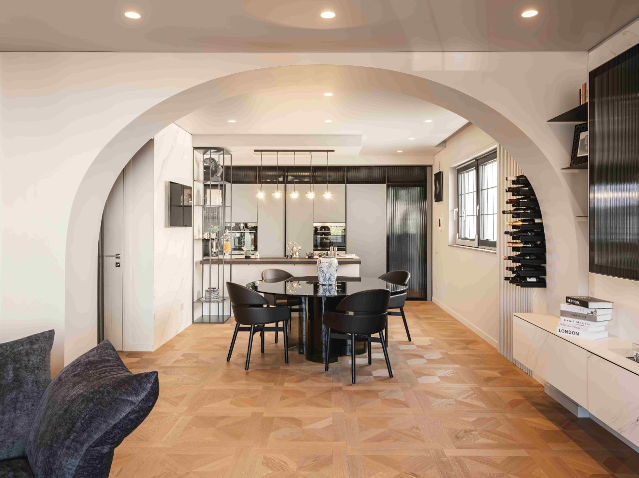 Gli ambienti sono caratterizzati da arredi su misura, pavimenti in legno pregiato e materiali di alta qualità, con una combinazione di contrasti armonici che danno vita a un’atmosfera raffinata e accogliente. Il piano rialzato, che ospita l’abitazione principale, include spazi come l’ingresso, il living, la cucina, i bagni e le camere da letto. La zona giorno, in particolare, è dominata da un ampio arco ribassato che incornicia l’area pranzo, aggiungendo un tocco architettonico distintivo che addolcisce le linee moderne degli arredi.