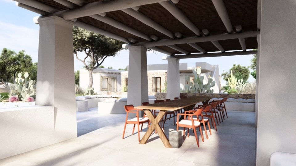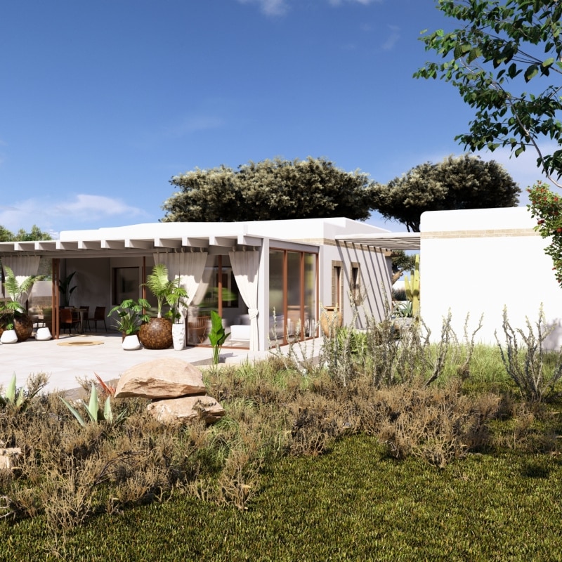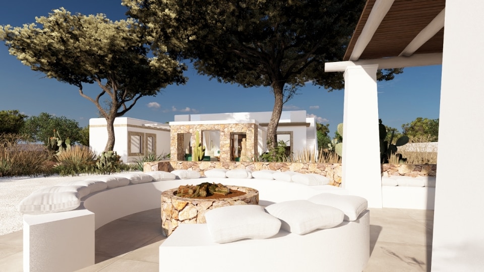 Il riferimento tipologico è quello dei pagliari e dei casolari rurali settecenteschi, assunti non come citazioni stilistiche ma come nuclei generativi. La pietra locale e il tufo delle cave di Tremola diventano materia strutturale in dialogo con il paesaggio circostante. I volumi sono misurati, le relazioni tra interno ed esterno costruite sul tempo lungo dell'osservazione. Non si tratta di stupire, ma di durare.