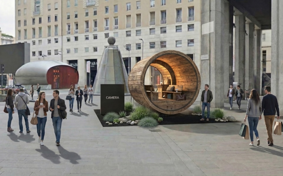 In occasione del Fuorisalone 2026, Progetto CMR porta in Corso Vittorio Emanuele II, all'incrocio con Piazza San Babila, un'installazione che sceglie di sottrarsi alla logica dello spettacolo per proporre qualcosa di più raro: il silenzio, la concentrazione, la meraviglia. CAMERA — Inside the Lens è una micro-architettura in legno che prende forma ispirandosi alla struttura di un obiettivo fotografico — diaframmi concentrici, proporzioni calibrate, una geometria che guida lo sguardo verso un punto preciso — e che diventa, per sette giorni, uno dei luoghi più inattesi della settimana del design milanese.