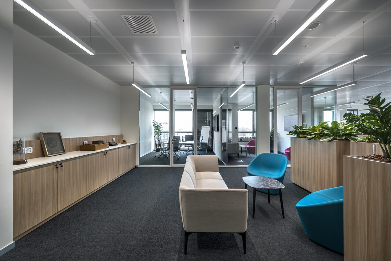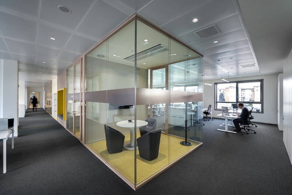 All’interno dell'edificio, grandi open space sono interrotti puntualmente solo dai dispositivi di risalita, che organizzano i piani in 3 macro-aree, assecondando al meglio le esigenze della società.