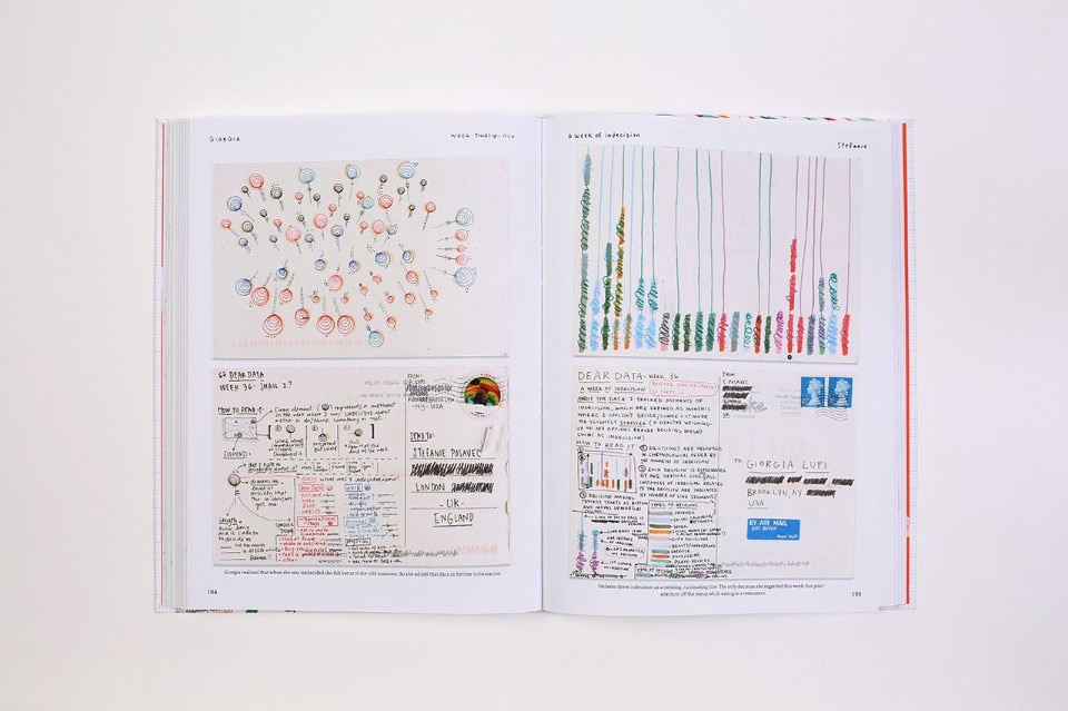Giorgia Lupi, Stefanie Posavec: Dear Data è stato l’occasione per avviare una ricerca a lungo termine su vari aspetti della nostra vita. Alcune settimane sono state particolarmente illuminanti, specialmente quelle che toccavano aspetti delicati, come le nostre ossessioni e paure, o quelle più personali, come le relazioni con i nostri fidanzati e mariti. Nel corso dei mesi si è andato via via componendo un ‘ritratto’ dell’altra attraverso quei 52 piccoli frammenti della personalità. È stato possibile ricostruire pensieri, abitudini, il suo particolare modo di affrontare le situazioni. Così, ciò che scoprivamo ogni settimana andava ad aggiungersi all’idea che ci eravamo fatte. Ma la lezione più importante è stata certamente capire l’importanza di prestare attenzione a noi stessi e a quanto ci circonda. Grazie al progetto abbiamo fatto pratica. Abbiamo imparato come si fa a essere più attente.