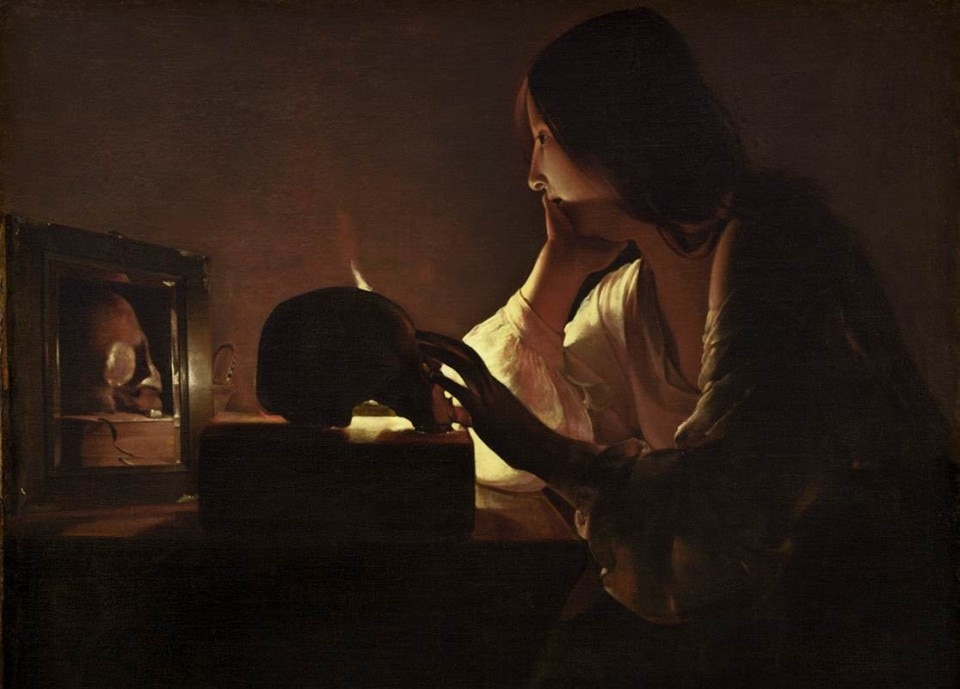 Osservatore raffinato della natura e della vita quotidiana, a partire dalle opere giovanili, de La Tour viene collocato a fianco dei protagonisti del Barocco, più precisamente del naturalismo seicentesco. Manifesto espositivo della mostra è infatti la sua Maddalena Penitente, descritta appunto da una tenue, ma al contempo viva, luce di una sola candela che dona al corpo della donna volume e forza. Tutto è perfettamente studiato. Dal centro della scena la luce s’irradia, dando possibilità allo spettatore di leggere e comprendere i numerosi dettagli che il maestro descrive o interpreta attraverso una seducente mimica del volto: le labbra appena socchiuse, la mano che le sfiora ma sostiene i pensieri, i capelli poco ordinati, che come da tradizione vengono descritti lunghi e sciolti, messi in evidenza appena sopra la fronte da quella luce che sembra essere l’ideatrice di ogni cosa. Soprattutto dei suoi pensieri. Per finire il teschio, solito attributo iconografico della Maddalena, ricorda anche qui lo scorrere del tempo ma con una doppia rappresentazione: il teschio si ripete nello specchio. A chiedere allora di essere guardata non è più la giovane donna, ma la fiamma, che indica, illuminando e oscurando entrambi i lati del teschio e che spinge o costringe ad una riflessione sull’inesorabile scorrere del tempo. La vita e la morte.