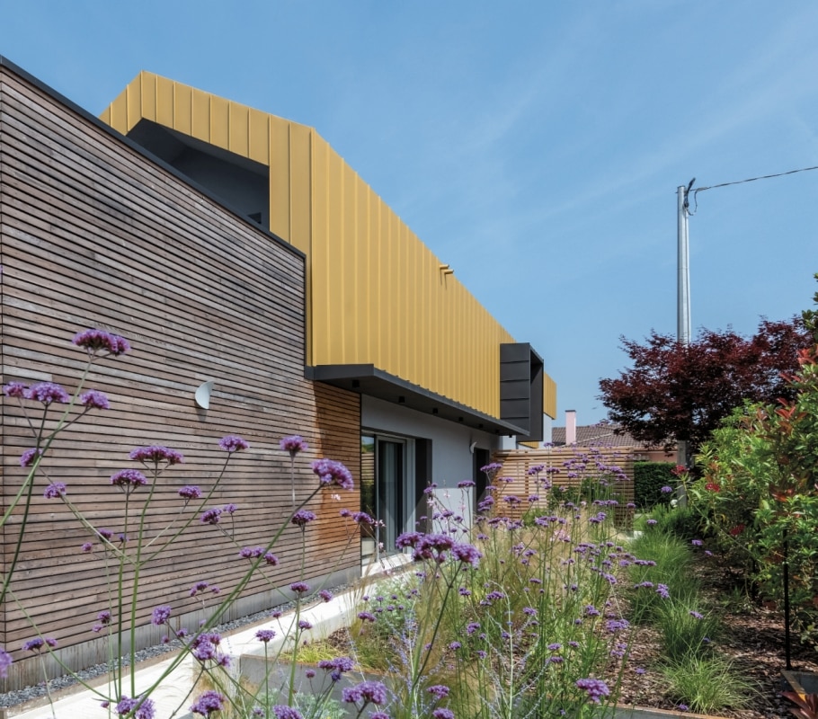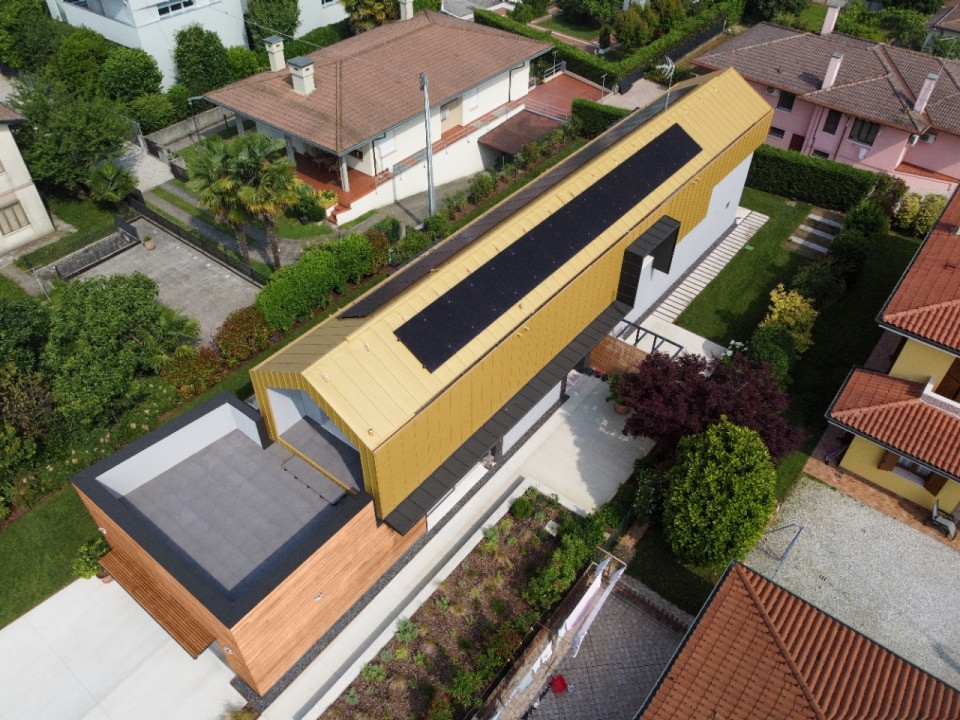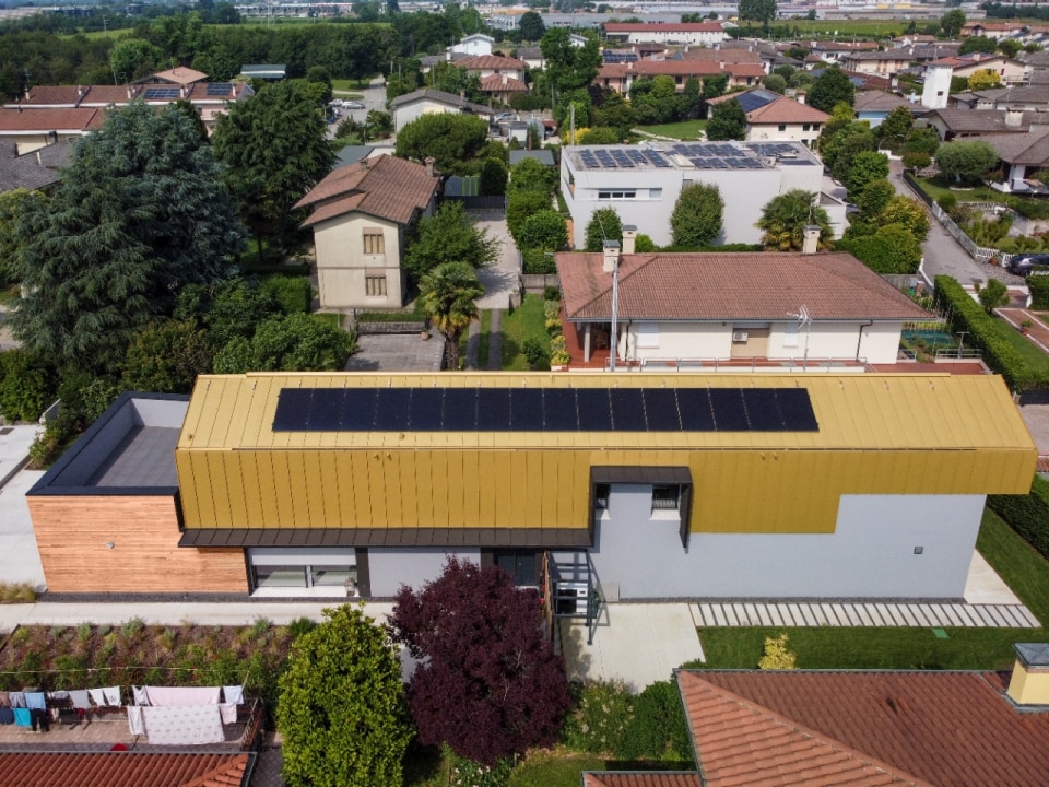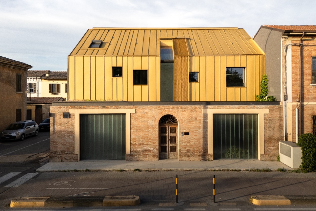 A raccontare a Domus l’avventura di famiglia nel “Magico Mondo del Metallo” (per parafrasare la fiaba di cui sopra) è l’architetto Jacopo Mazzonetto, “figlio d’arte” che dal papà Diego (architetto e designer) ha ereditato la passione per questo poliedrico materiale. E lo fa dal giardino di “Casa D’Oro”, abitazione mono-famigliare a Castelfranco Veneto (Treviso) da lui progettata insieme al team tecnico dell’azienda e da poco completata: volumi semplici, chiaramente aggregati a comporre un’efficace ripartizione funzionale, dove la “pelle” in alluminio verniciato a lastre graffate sagoma la copertura di colore dorato (Vestis Gold) e la veletta aggettante nero grafite, stagliandosi vigorosamente sul corpo abitativo in cemento grigio e conferendo all’edificio un carattere peculiare e accattivante. Come afferma Jacopo: “la pelle è il primo elemento che si nota in architettura; divide l’interno dall’esterno ma soprattutto ripara e protegge l’architettura stessa. Ci sono molti esempi di architetture iconiche che hanno esaltato l’uso della “pelle” metallica come rivestimento, dal Guggenheim Museum di Frank Gehry a Bilbao, al Nemo di Renzo Piano ad Amsterdam, al Museo Ebraico di Daniel Libeskind a Berlino: in tutti questi interventi, il metallo diventa attore principale del progetto e architettura stessa, talvolta anche andando in contrasto con l’esistente”.