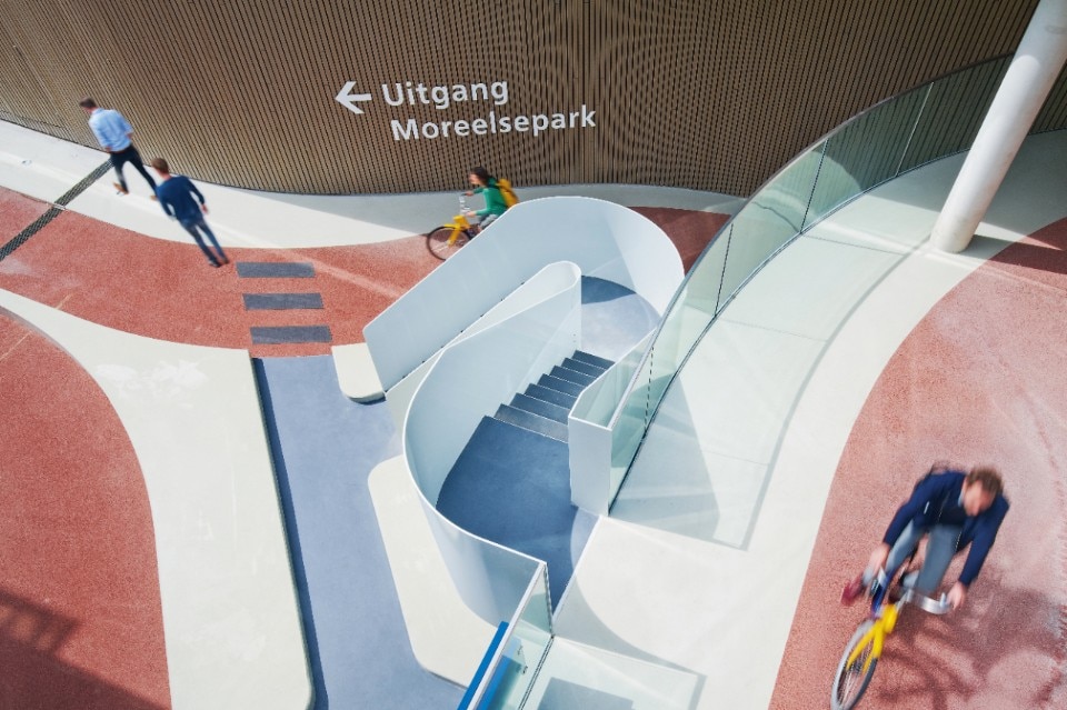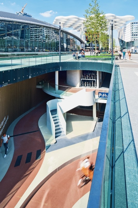 Sotto la piazza si trova un parcheggio per biciclette a tre piani progettato per ospitare fino a 12.500 mezzi con rampe in leggera pendenza per facilitare il passaggio dei ciclisti da un livello all’altro. In questo modo, ci si può muovere all’interno della struttura senza scendere dalla sella mentre si cerca un posto disponibile, aiutati dai display elettronici alla fine di ogni fila di biciclette. Tre scale permettono alla luce naturale di entrare in profondità nella struttura e forniscono un facile accesso alla piazza e all’edificio principale del terminal, mentre al livello più basso i tunnel conducono direttamente ai binari ferroviari. È possibile quindi entrare e uscire in cinque minuti.